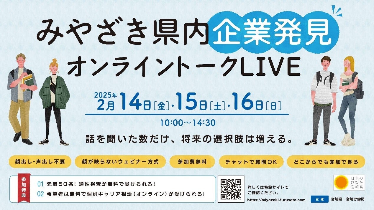 宮崎県外に進学している大学生や宮崎県での就職・転職を希望する一般の方等を対象として、宮崎県内企業約100社によるオンライン就職イベント「みやざき県内企業発見オンライントークLIVE」を開催します。※要事前申込み