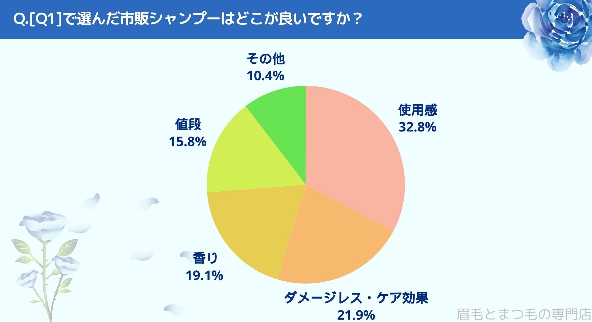 [Q1]で選んだ市販シャンプーの良いところをお聞きしたところ「使用感(32.8%)」、「ダメージレス・ケア効果(21.9%)」、「香り(19.1%)」、「値段(15.8%)」、「その他(10.4%)」という結果になりました。