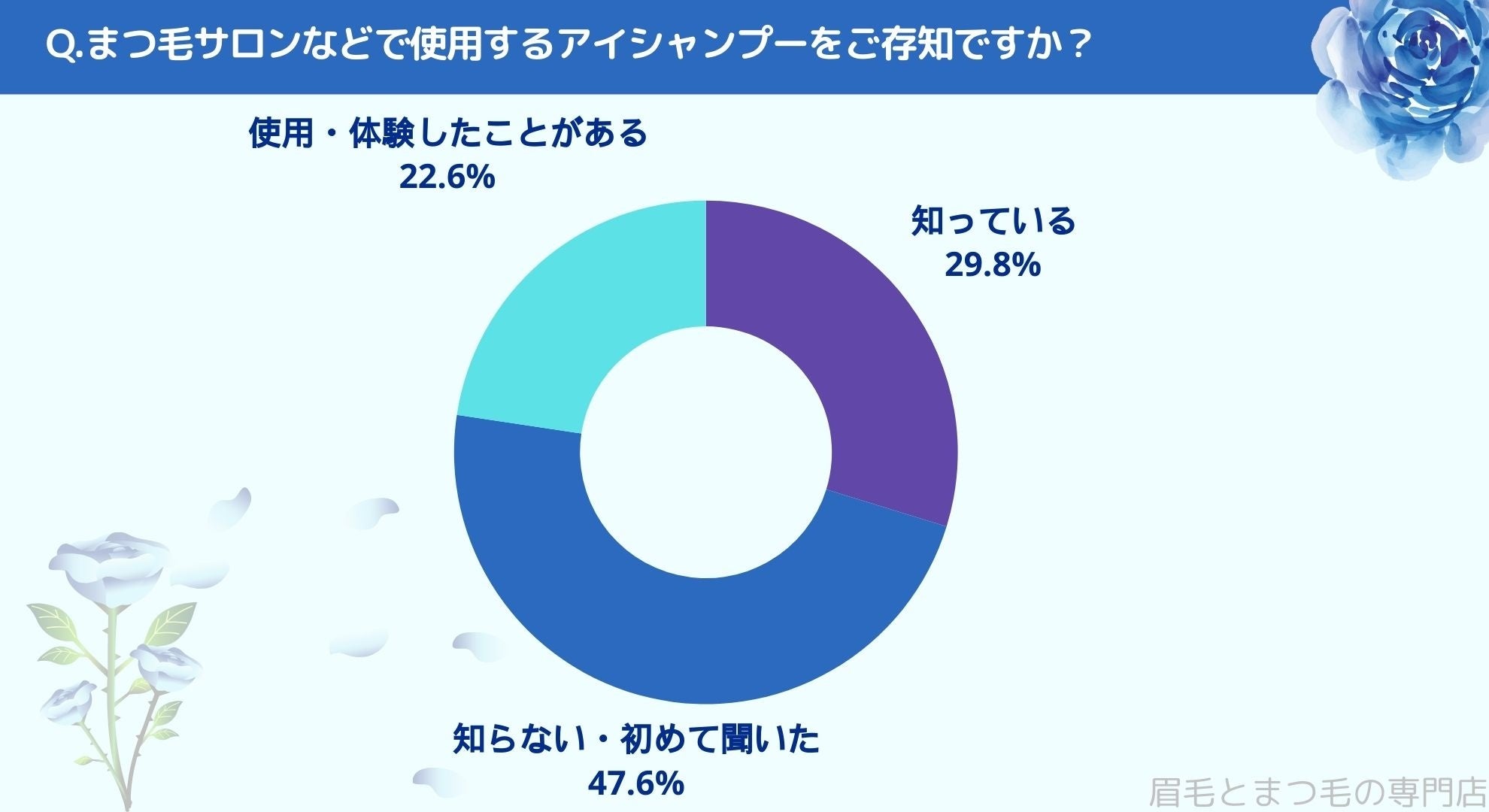 まつ毛サロンなどで使用するアイシャンプーをご存知かお聞きしたところ「知っている(29.8%)」、「知らない・初めて聞いた(47.6%)」、「使用・体験したことがある(22.6%)」という結果になりました。
