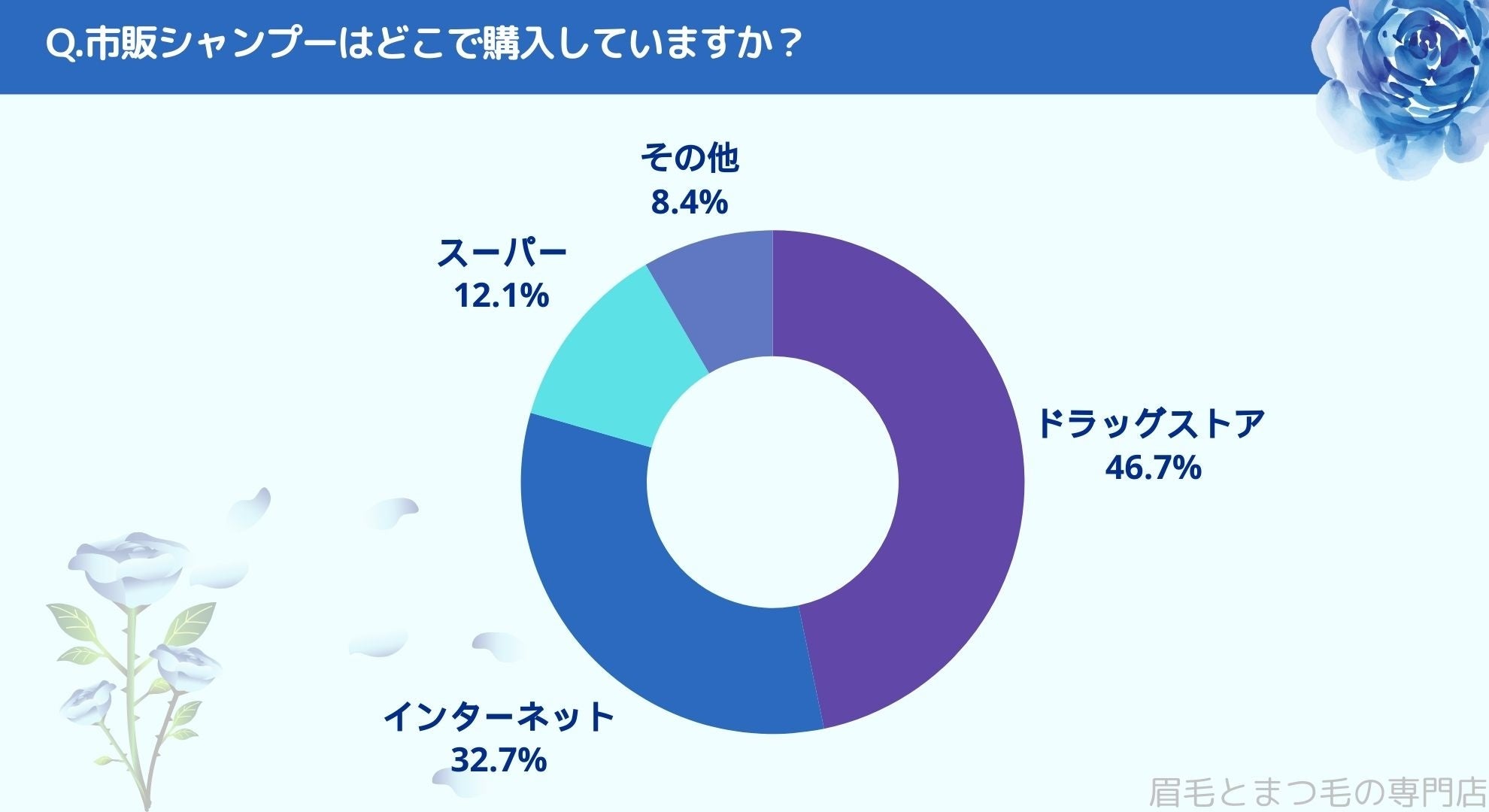 市販シャンプーをどこで購入しているかお聞きしたところ「ドラッグストア(46.7%)」、「インターネット(32.7%)」、「スーパー(12.1%)」、「その他(8.4%)」という結果になりました。
