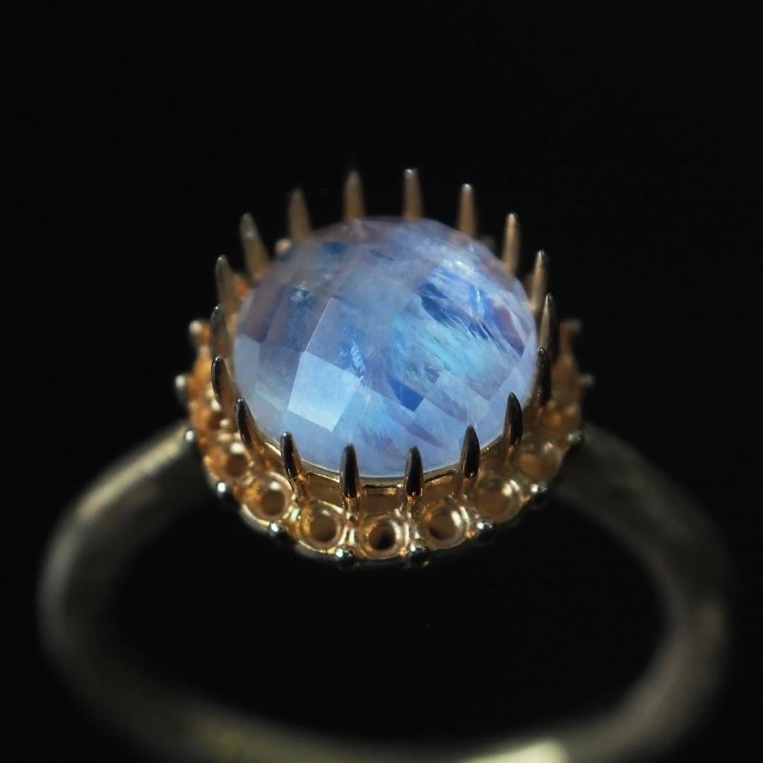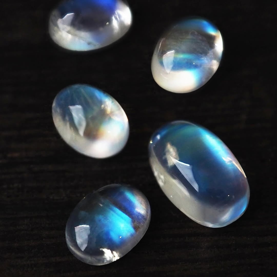 今月は、6月の誕生石でもある「ムーンストーン」を中心に、色や光の移ろいが素敵なルースを多数揃えました。なかでもブルームーンストーンは、艶やかなカボションカットやチェスカット、ポンポネ枠に対応するオーバル型など、多彩な表情で取り揃えました。