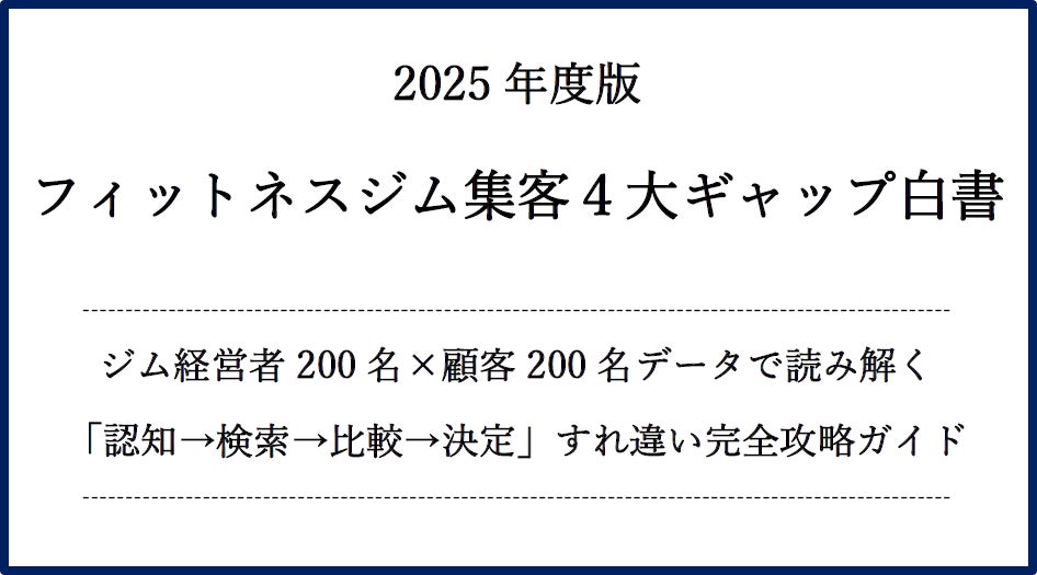 調査では、加入者がフィットネスジムを選ぶ際に重視するポイントを、「認知・検索・比較・決定」の4つのステップに分類。各段階で経営者の予想と加入者の実際の考え方・行動の差を徹底的に分析し、その結果を『2025年版 フィットネスジム集客4大ギャップ白書』として期間限定で無料公開します。