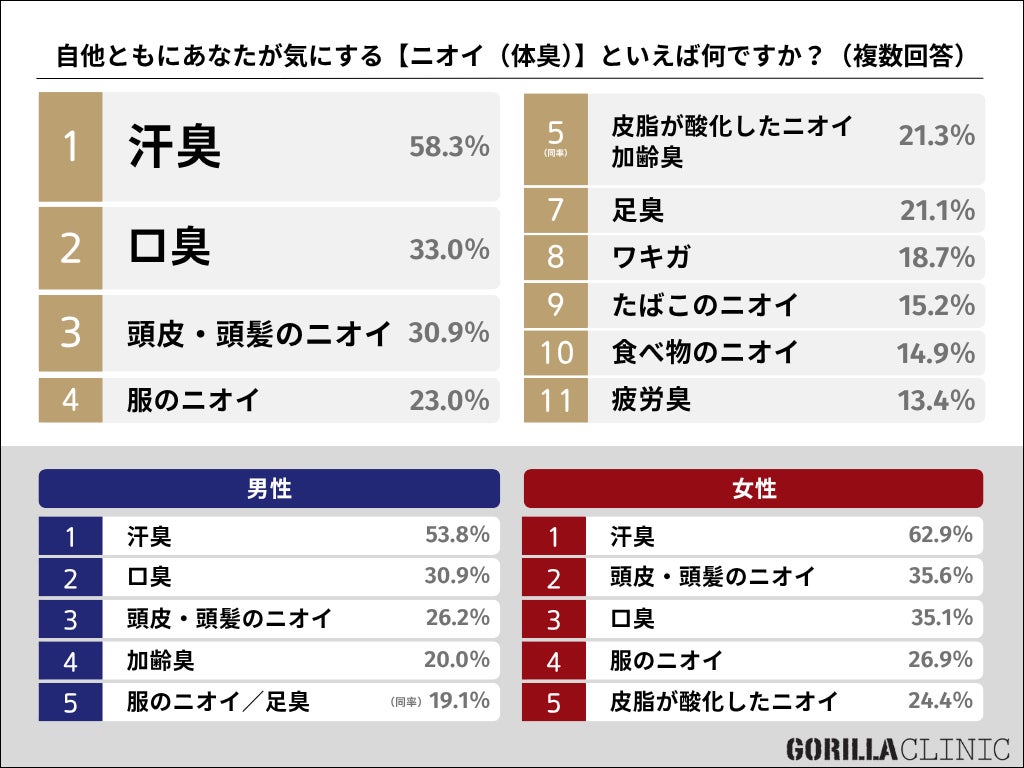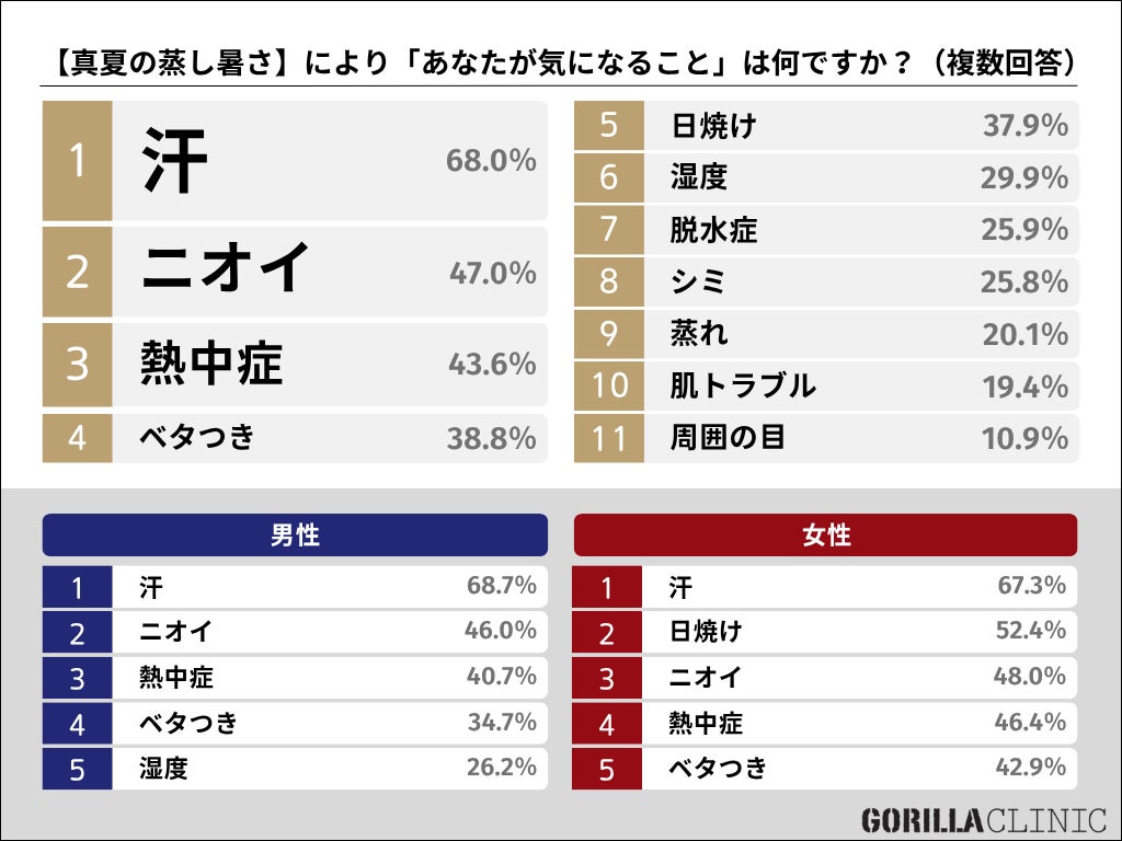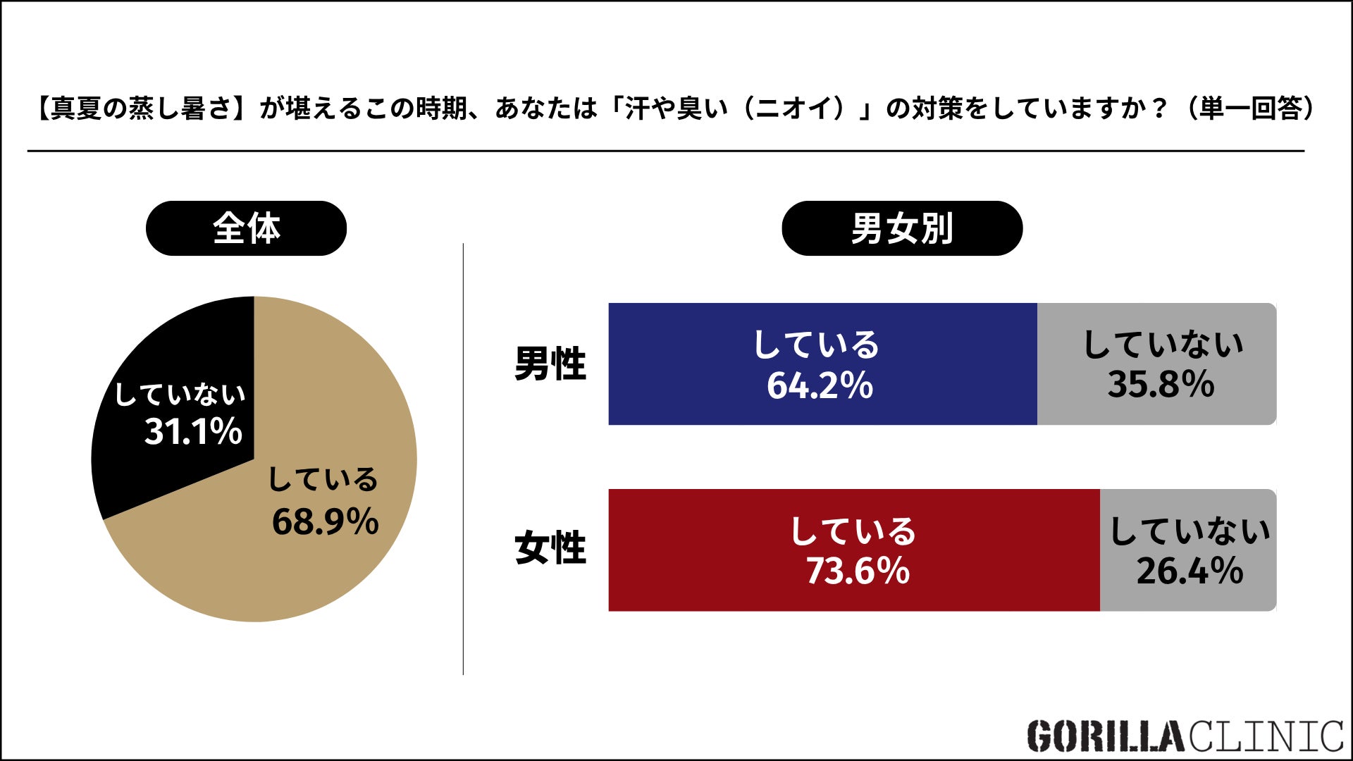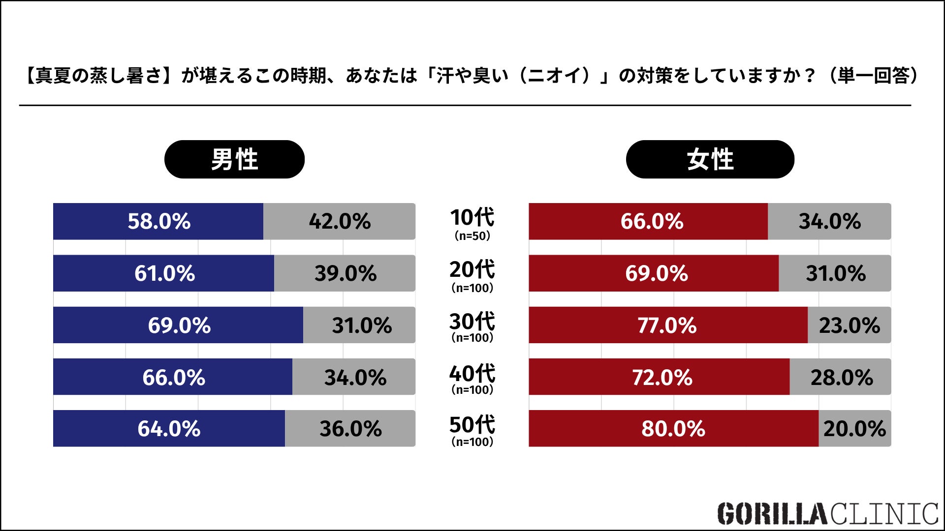 そこで、全国22院展開する男性専門の総合美容医療「ゴリラクリニック」(医療法人社団十二会/東京都新宿区、稲見文彦総院長、以下「当院」)は、2025年8月1日の1日間、10~50代の男女900名を対象に【汗やニオイに関する意識調査】を実施しました(インターネット調査)。