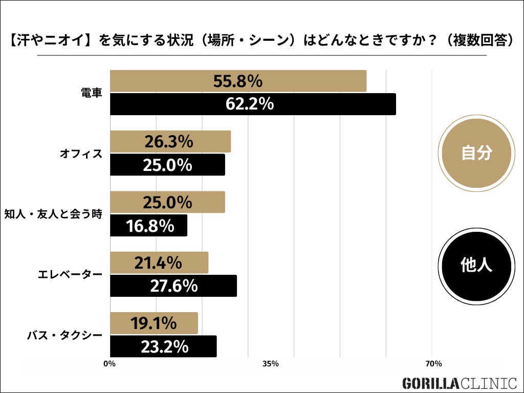 自分のニオイを気にする場面では「電車」が55.8%でトップ。他人のニオイを気にする場面でも「電車」が62.2%でトップに。比較すると、自分のニオイ以上に、他人のニオイへの敏感さが際立つ結果に