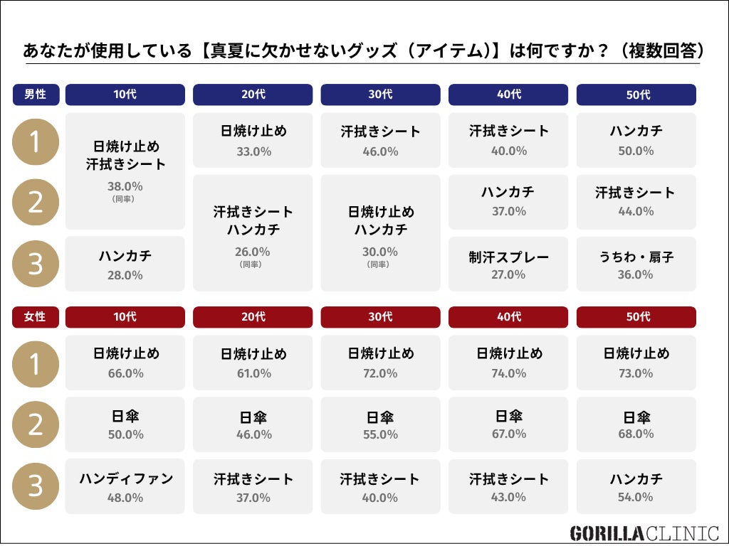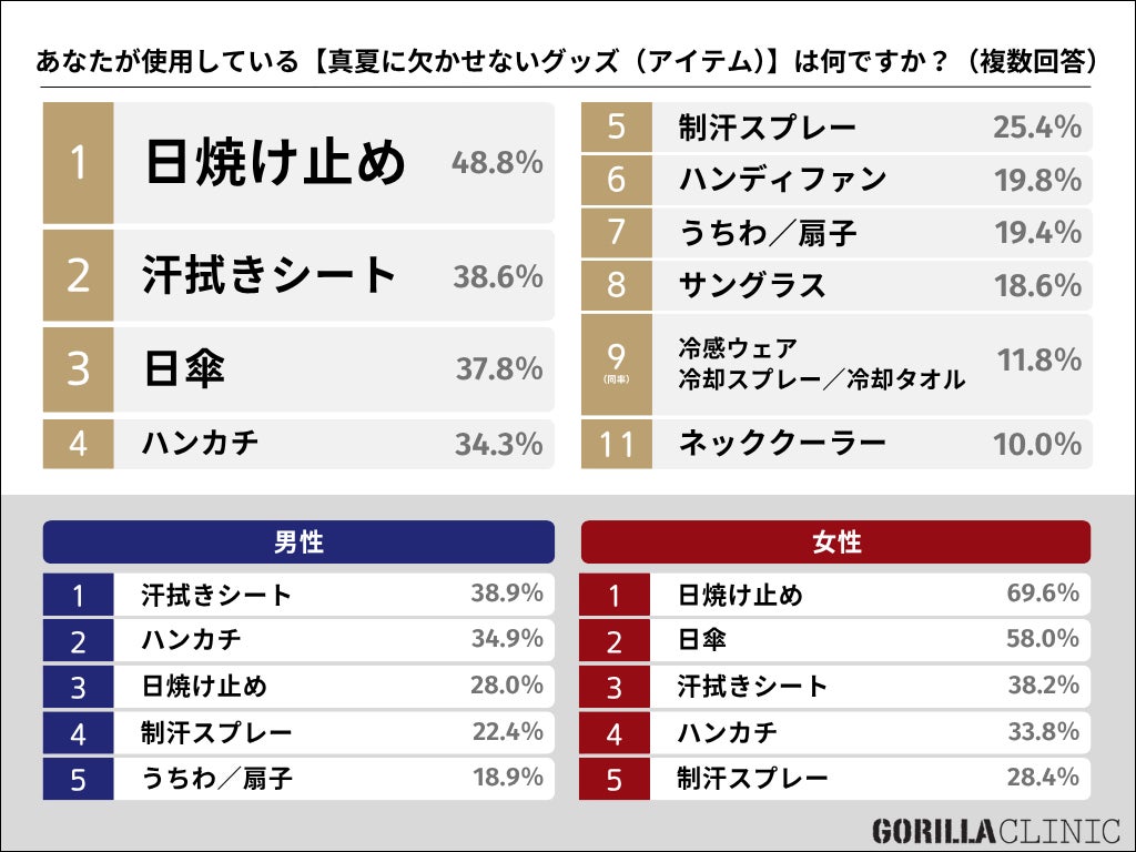 男性は汗拭きシート(38.9%)、ハンカチ(34.9%)など「汗対策」中心に対し、女性は日焼け止め(69.6%)、日傘(58.0%)など「日焼け対策」中心。同じ夏でも対策アプローチが大きく異なることが判明