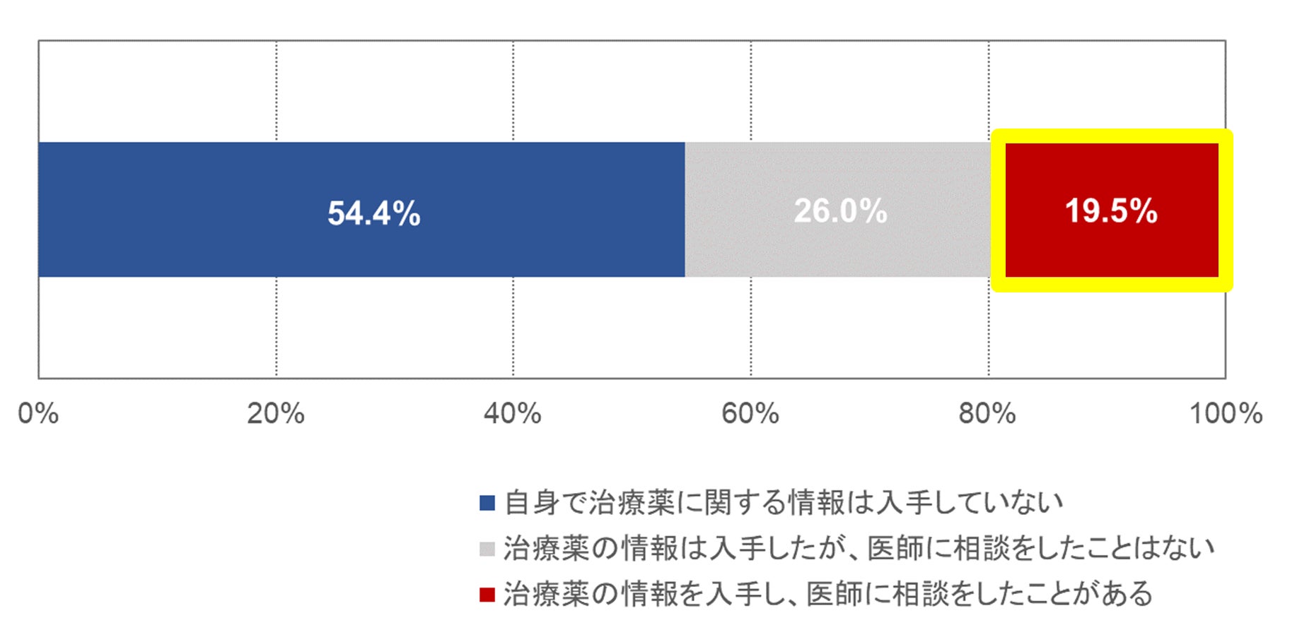 一方、子どものアトピー性皮膚炎の治療薬に対して現在よりも治療強化をしたいと回答した母親(n=215)のうち、実際に自分で情報を入手し、その治療について医師に相談をしたことがある母親は19.5%という低い結果でした。母親は、子どものアトピー性皮膚炎の治療を強化したいと思いつつも、自分で情報を調べたり、医師へ相談したりすることに消極的であることがわかりました(図2)。