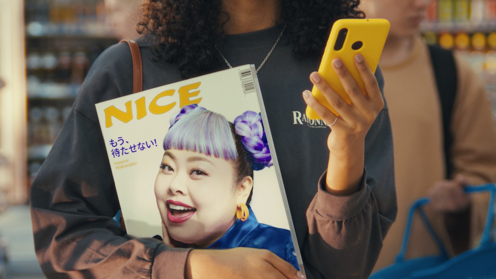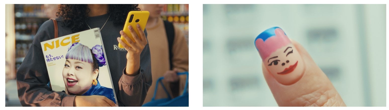 新CMコンビニ篇では、「Visaのタッチ決済」をコンビニで利用するシーンが描かれています。レジで順番を待つお客様が抱える雑誌の表紙に渡辺直美さんが登場。前のお客さんがタッチでお会計を完了させるスムーズなお会計を見て表紙の中からウィンクする様子が描かれています。スーパーマーケット篇では、お会計中の女性の手元のネイルチップには渡辺さんそっくりの絵柄が描かれています。暗証番号不要で簡単に支払いが完了するタッチ決済を見て、ネイルチップの渡辺さんもご満悦のウィンク。あらゆる生活シーンの中で、スピーディーでスムーズ、かつ安心・安全な「Visaのタッチ決済」をコミカルに描いています。