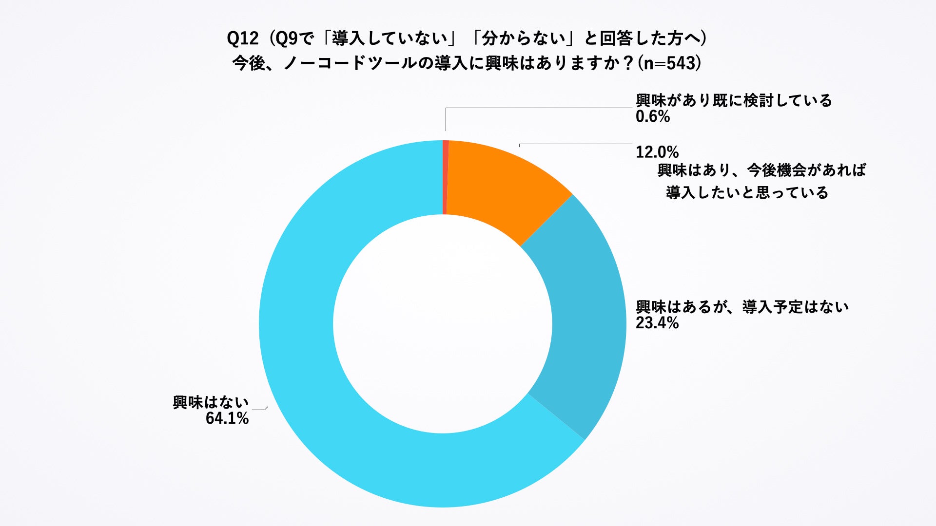 最後にノーコードツールを導入していない企業の方に向けて、導入意向を尋ねたところ、「興味はない」との回答が64%ともっとも多く、「興味はあるが、導入予定がない」(23%)も含め、導入以降がない人が大半を占める結果に。知名度とともに、「ノーコードツール」のメリットがまだ理解されていないことが分かりました。