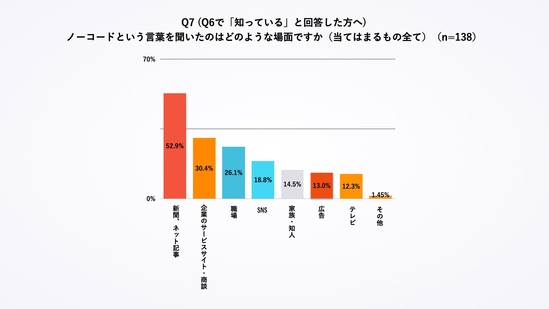 また「ノーコード」という言葉の認知経路としては、50%以上が「新聞・ネット記事」と回答。近年さまざまなメディアでノーコードをテーマとした特集が組まれたことが、認知のきっかけになっていると考えられます。また、「企業のサービスサイト・商談」が30%と、企業が自社サービスを「ノーコードツール」として打ち出していることも、認知につながっているようです。