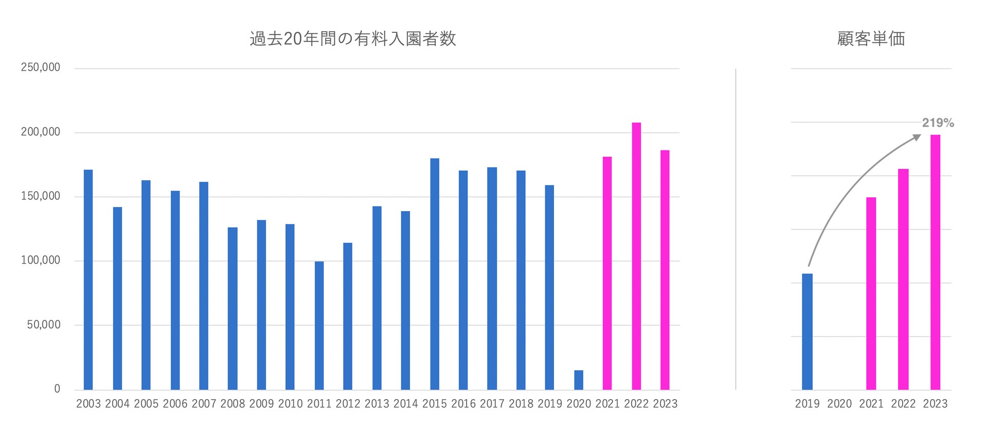 2021年のリニューアルオープン以降、入園者数はグラフのように増加。(下記画像左)