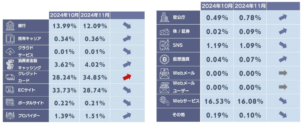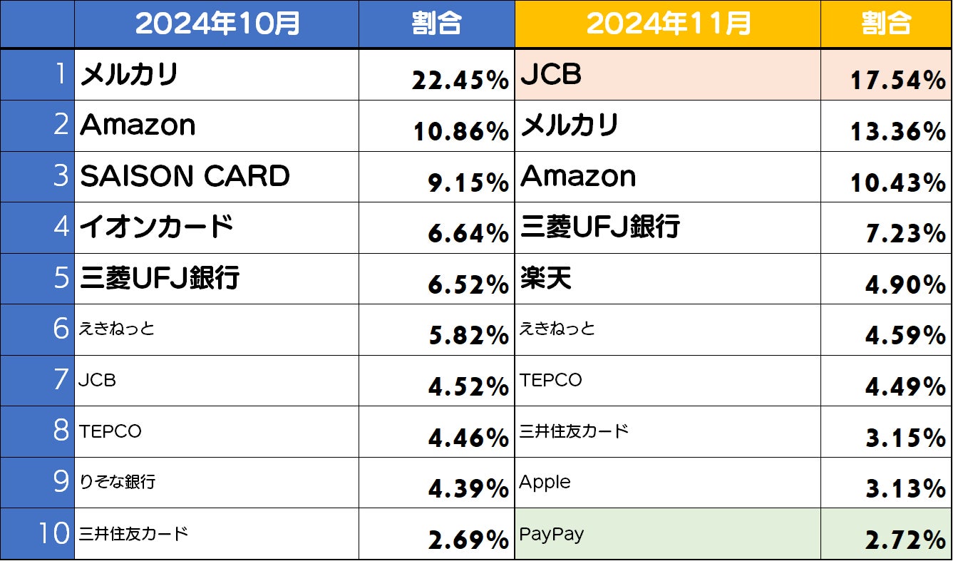 11月度は報告数が3倍に増加したJCBが1位となりました。前月1位だったメルカリも高止まりしています。5位に新しく登場した楽天は報告数が10倍以上増加しており注意が必要です。