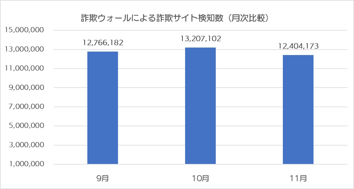 2024年11月の詐欺ウォールによる詐欺サイト検知数は12,404,173件で、2024年10月と比較すると、802,929件減少する結果となりました※。