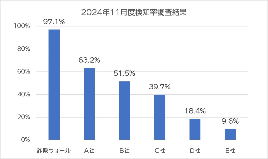 詐欺ウォールを開発・提供するBBソフトサービスでは、公的機関などとの連携によって収集した詐欺サイトURLを利用し、定期的に詐欺サイトの検知率調査を行っています。2024年11月の詐欺ウォールによる詐欺サイト検知率は97.1%と、アンチウイルス機能を搭載したセキュリティ製品各社と比較し高い結果となりました。