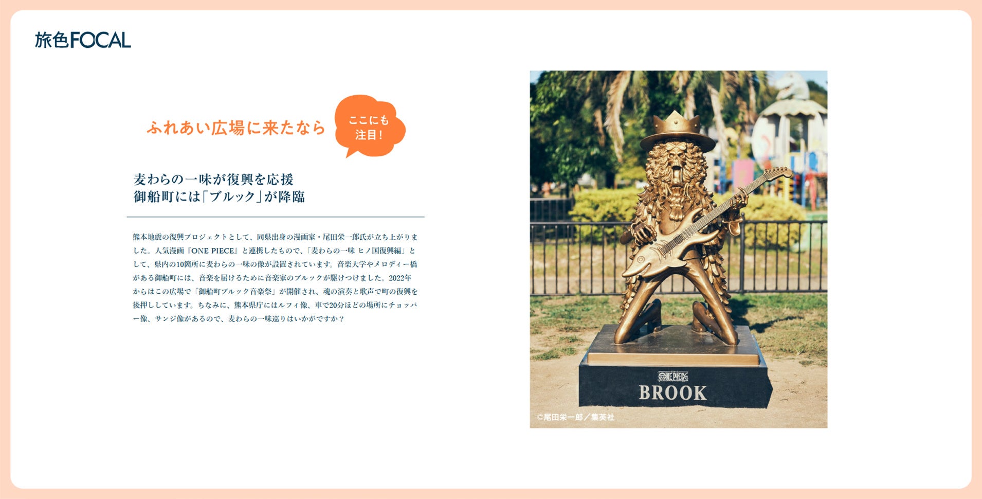 熊本県では2016年に発生した熊本地震をきっかけに、熊本県出身の漫画家で、海外でも人気が高い『ONE PIECE』の作者である尾田栄一郎さんと熊本県が連携した『ONE PIECE 熊本復興プロジェクト』が立ち上がり、2019年度からは、県内10箇所に麦わらの一味の仲間の像が設置されています。熊本地震で多くの住宅が被害を受けた同町には、音楽大学やメロディー橋があることから、音楽家のキャラクター、ブルックの像が建てられています。2023年の熊本県の訪日外国人宿泊数は2019年を上回る増加を続けているため、「旅色FOCAL」御船町特集の英語版、繁体字版の紙冊子で、効果的なPRを実施いたします。