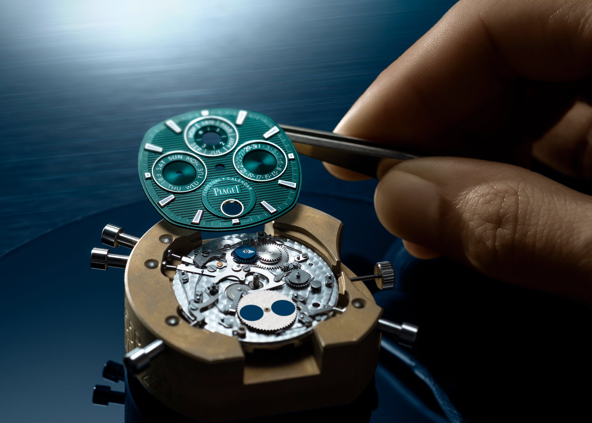 "ピアジェ ポロ パーペチュアルカレンダー ウルトラシン" には、ゴドロン装飾が施されたダークエメラルドグリーンの文字盤に、9時と12時と3時の位置に日付、月(閏年表示付き)、曜日を表示する3つのサブダイヤル、6時の位置にムーンフェイズが配置されています。スーパールミノバ加工のインデックスが映える文字盤は光によって表情が変化し、多面的な美しさを放ちます。コレクションのシグネチャーであるゴドロン装飾はケースとブレスレットの両方に施されており、ブレスレットまで装飾をあしらうことで、新世代の「ピアジェ ポロ」とそのルーツの繋がりがより一層強められています。ブレスレットには最新のシングルタッチシステムを採用し、文字盤のゴドロン装飾に呼応するデザインの快適なラバーストラップも付属します。