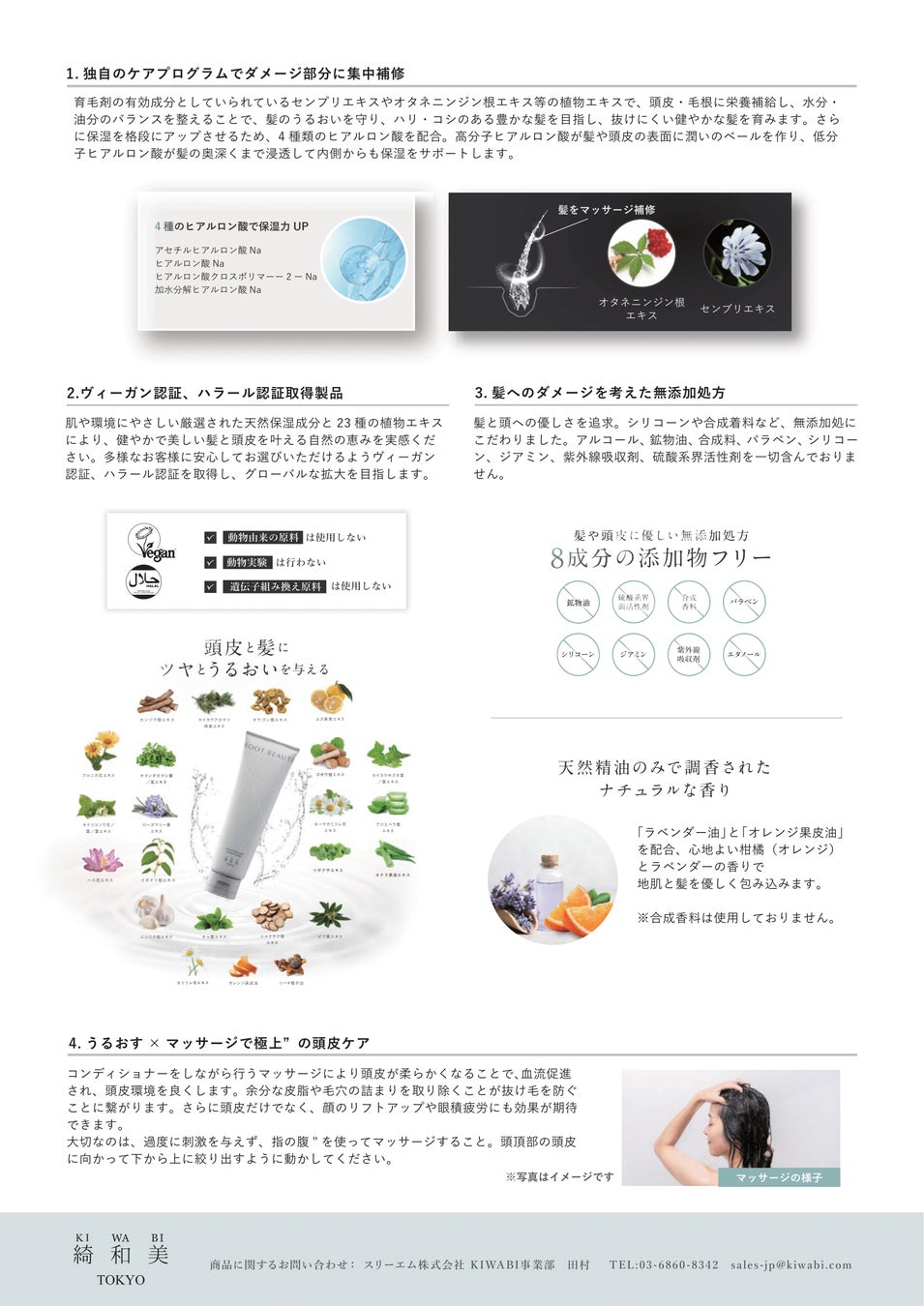 肌や環境にやさしい厳選された天然保湿成分と23種の植物エキスにより、健やかで美しい髪と頭皮を叶える自然の恵みを実感ください。多様なお客様に安心してお選びいただけるようヴィーガン認証、ハラール認証を取得し、グローバルな拡大を目指します。