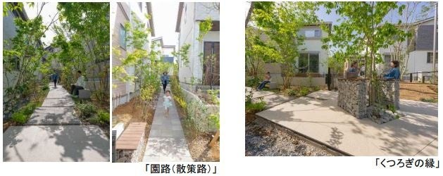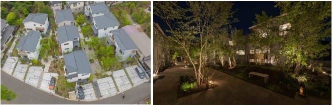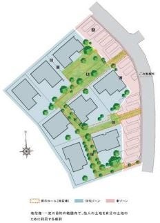 ●各住戸 200 ㎡以上のゆったりとした敷地 ●九州に 7 か所の自然農場を持つ(株)estplus17 のグリーンクリエイター小西範揚氏とエクステリアのプロ YKK AP(株)とコラボし、山で育った約 250 本の木々(高低だけではなく葉の大きさまで吟味)を移植、YKK AP の洗練 された商品を活かし、家の中からも外からも楽しめる緑の空間を創出。 ●緑の空間創出に当たっては、一部の敷地を全員でシェアする地役権を設定し、街区の中心に緑の広場、隣 地との間にブルーベリーや様々な果実が楽しめる散策路を設定。 ●各住戸の駐車スペース(2 台分)を設置道路側に集約。街区の中は歩車分離を実現。 ●隣地境界から住戸までの感覚は 1m以上確保し、室内から緑が楽しめるよう街区内に配置。 |