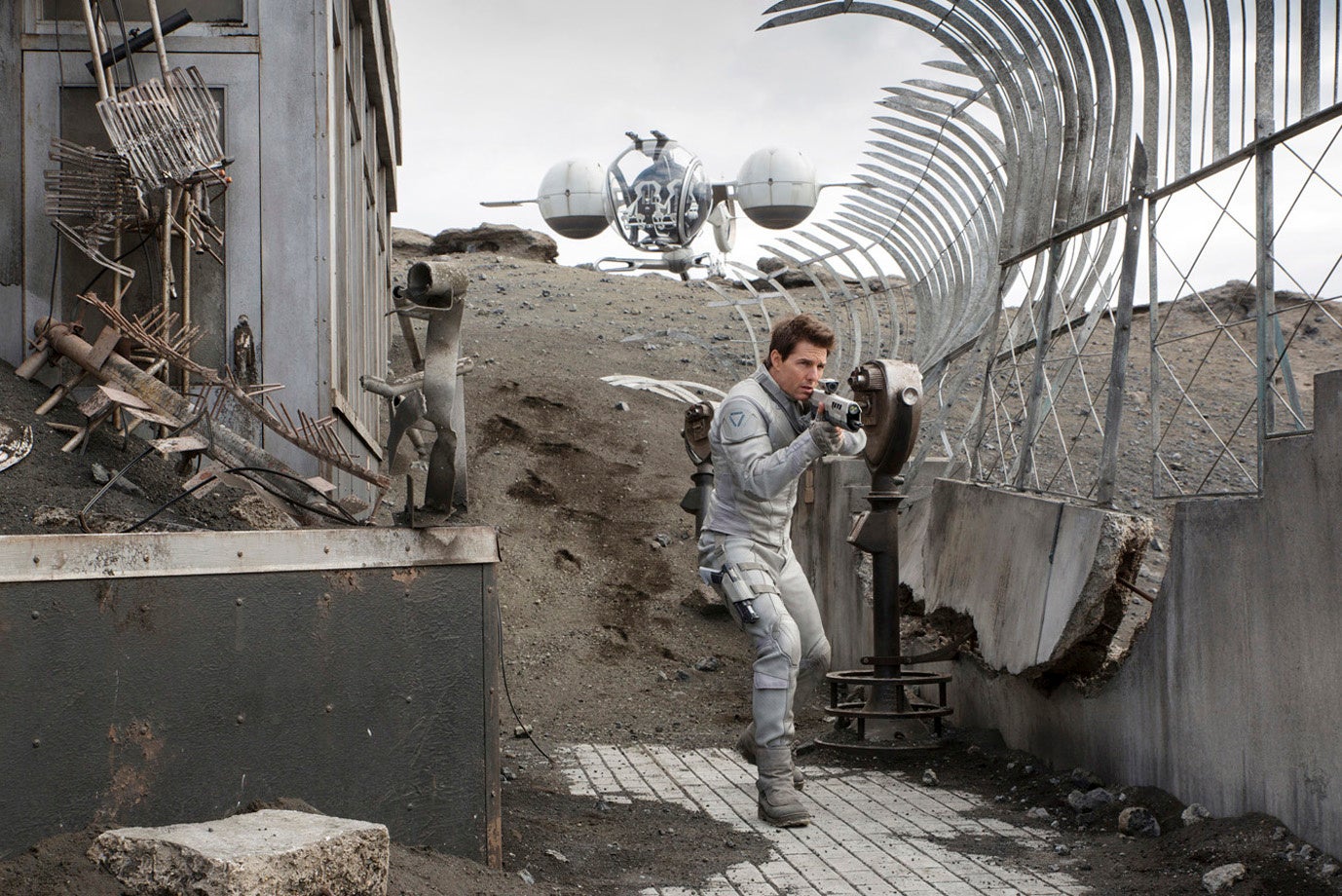 異星人の侵略を受けて地球は荒廃し、生き残った人類は他の惑星へ移住する。そして2077年。地球に残ったジャックとヴィクトリアが、無人偵察機ドローンを用いて地上を監視していた。任務終了まであと2週間となったある日、謎の信号を感知したジャックがパトロールしていたところ、未確認飛行物体が落下する。それはカプセル型の宇宙船で、中に乗っていた女性は、ジャックの夢に毎夜出てくる見知らぬ女性と瓜二つだった。