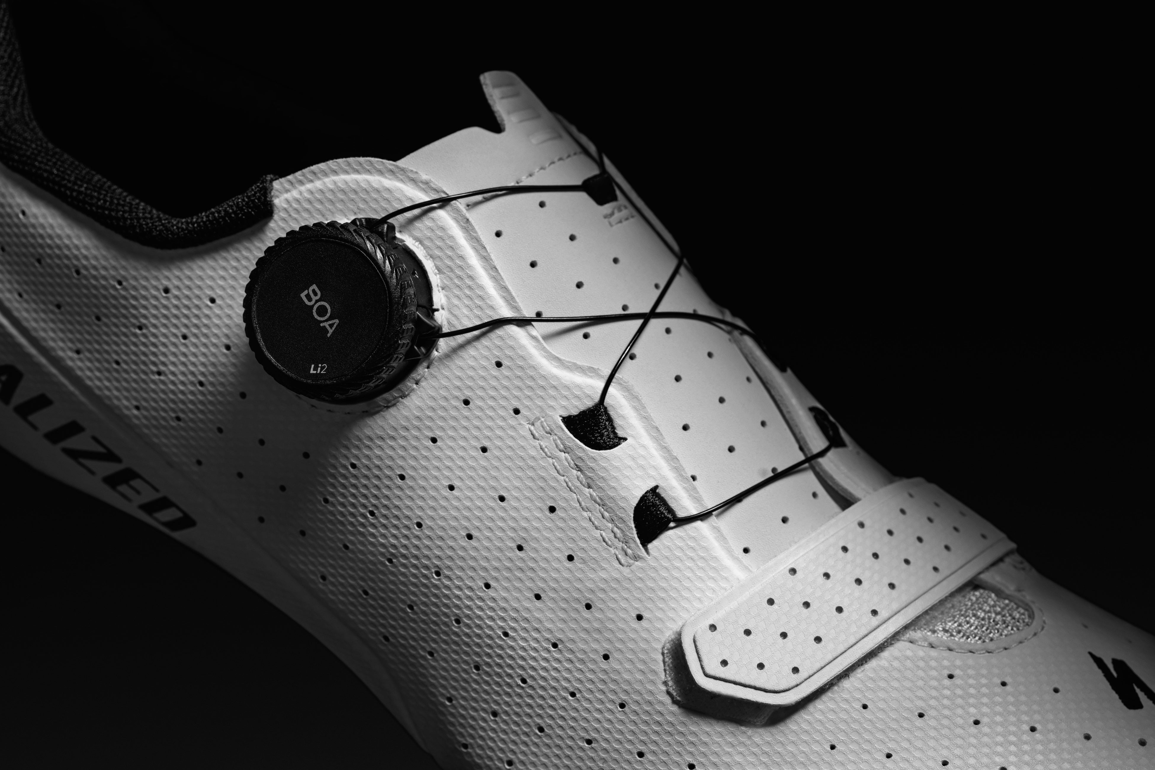 Torch 3.0のBoa ダイアルのレイアウトは、S-Works Torchがベース。高品質のLi2デュアルダイアルは、細かな調節が簡単です。長い上りできつく締めれば効率性が高まり、ロングライドやペースを抑えたライドで緩めれば快適に過ごせます。縫い目をなくしたTPUとメッシュ素材のアッパーは、S-Works Torchからヒントを得たパッケージ。同様のサポート性能や足の形状に寄り添う履き心地を実現し、足のズレを抑えてしっかりとホールドします。