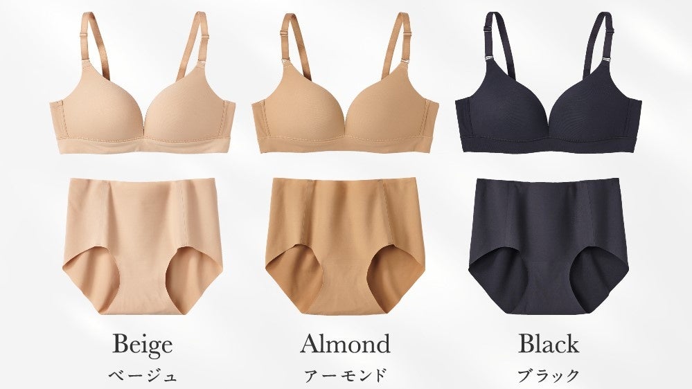 カラー展開:ブラジャー、ショーツともにベージュ、アーモンド、ブラック(全3色)