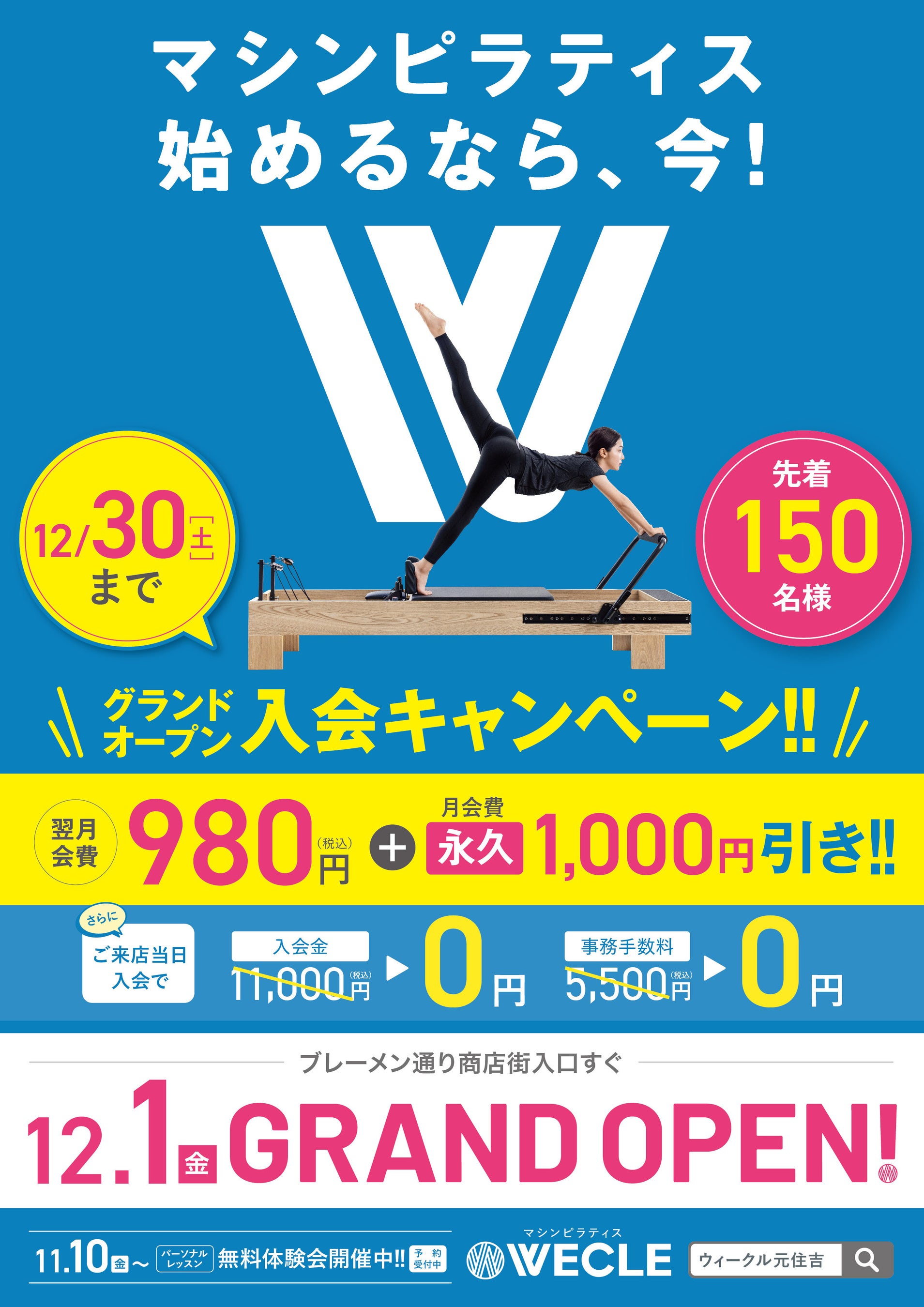 マシンピラティス専門店のWECLE(ウィークル)は通いやすさ・満足度・お得感でNo.1!12月1日から「翌月会費980円」さらに「月会費永久1000円割引」