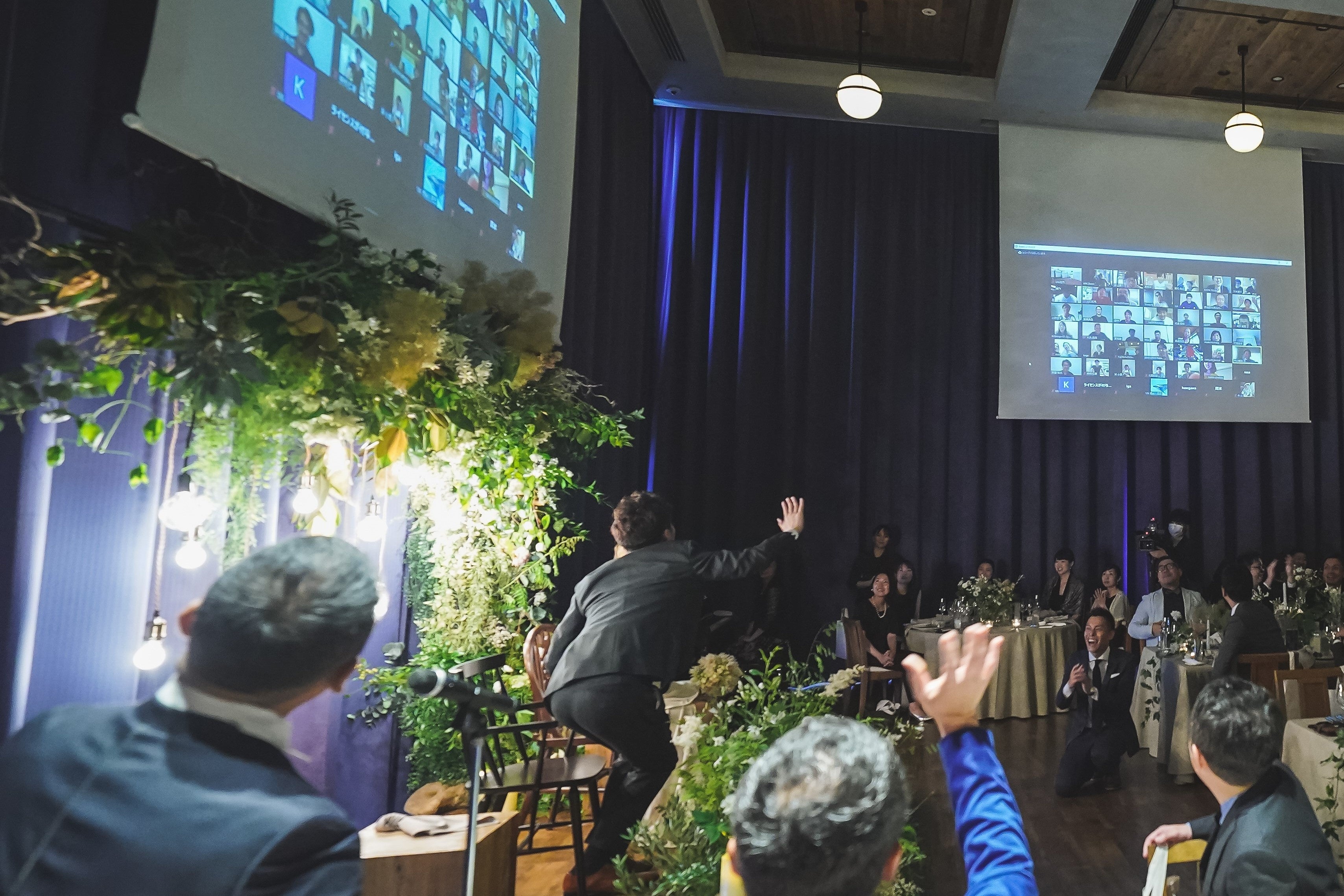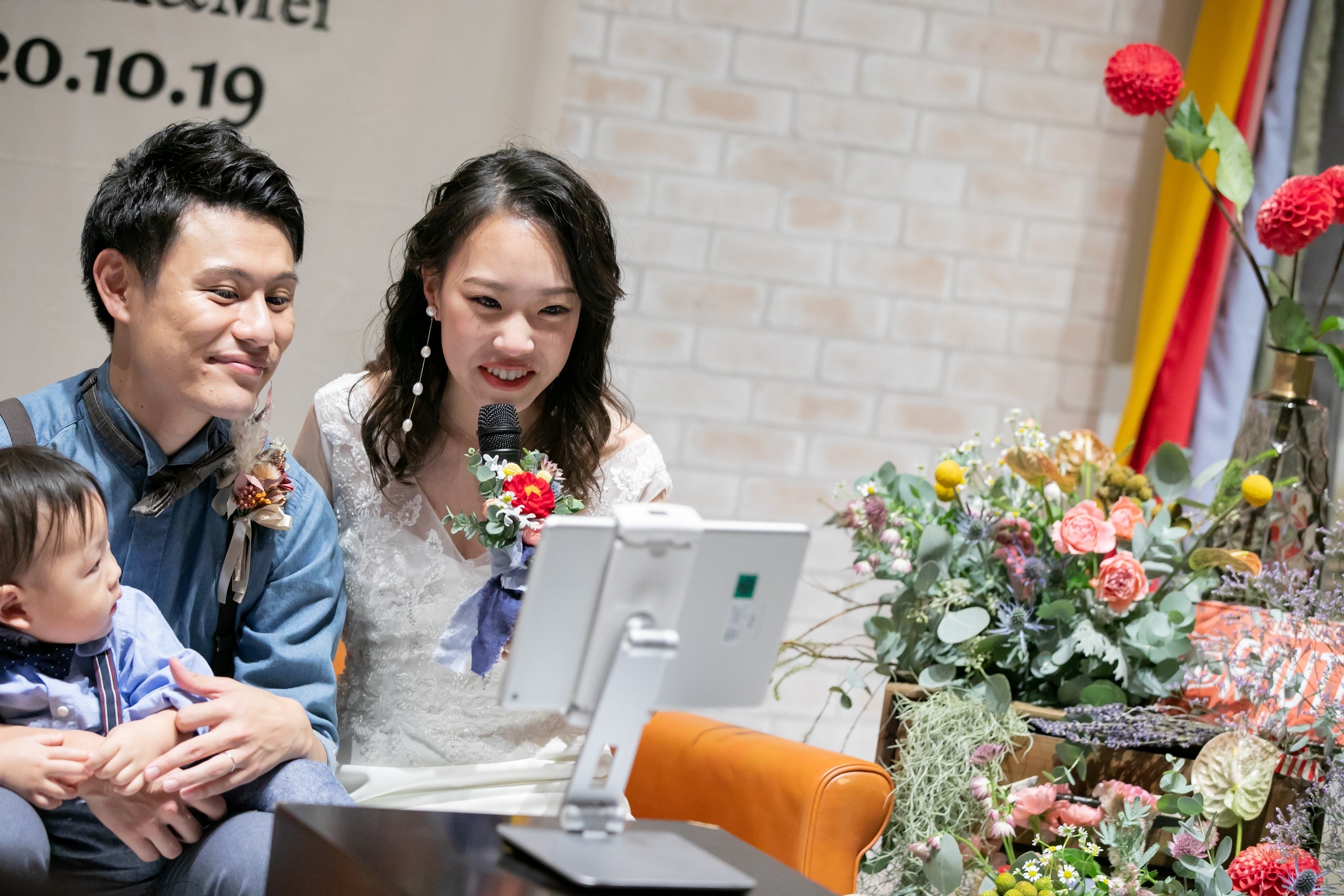 双方向でコミュニケーションが取れるため、インタビューを予定していたゲストがオンライン参列に なっても、画面越しに実施可能。画面を通じてでも会えたことに涙するおふたりとゲストの姿が印象的で、どんな形であっても大切な方と繋がることは素敵なことだと感じました。(ベイサイドパーク迎賓館 千葉みなと/菅井亜深)