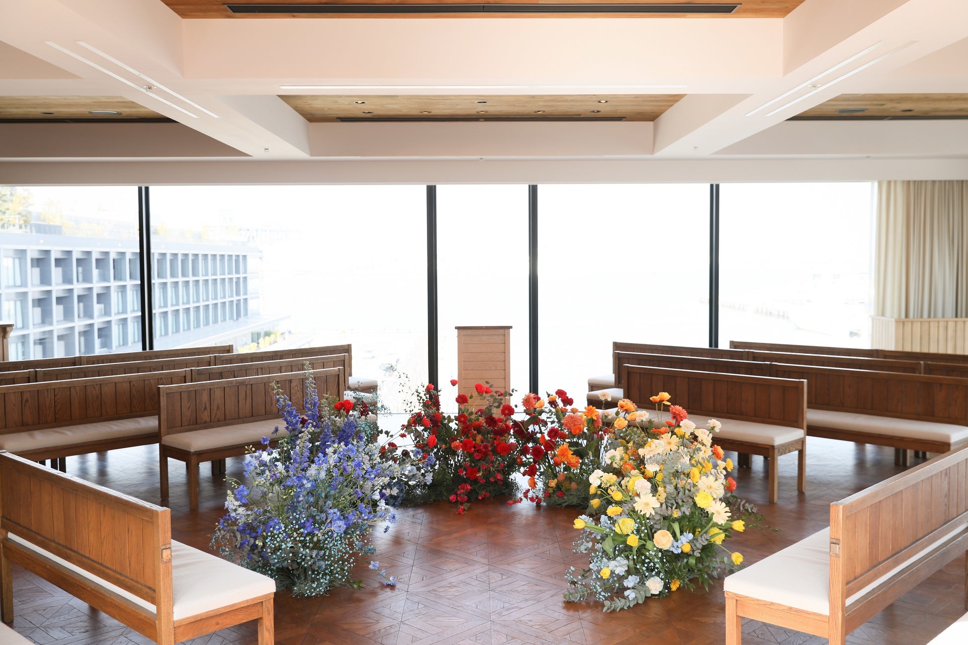 ゲストの椅子を、ご新郎ご新婦を中心にハの字やひし形にして、おふたりを囲むかたちで挙式をするとアットホーム感が増します。(ザ シーズンズ 横浜/藤本華菜)