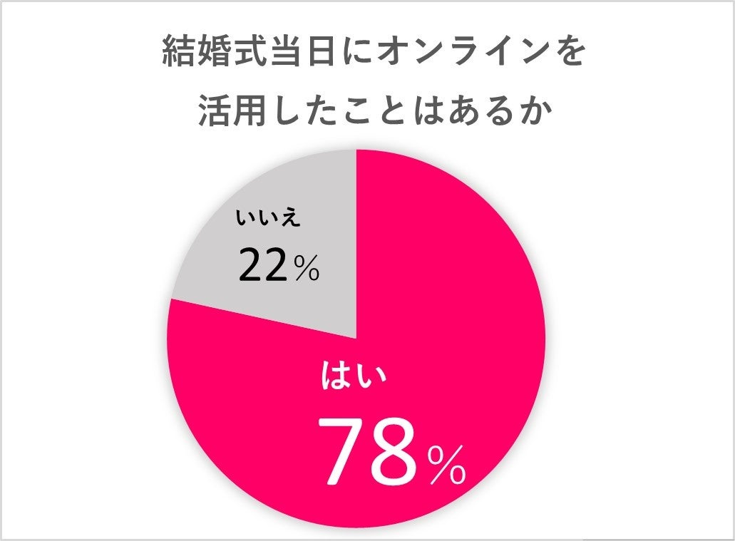 海外や遠方在住、コロナの感染リスクへの配慮など様々な理由で出席が叶わないゲストと会場をリアルタイムで繋ぐ「オンライン参列」が定着しつつあります。2020年2月以降に結婚式を担当したT&Gのウェディングプランナーのうち、78%が結婚式当日にオンラインを活用したことがあると回答しました。