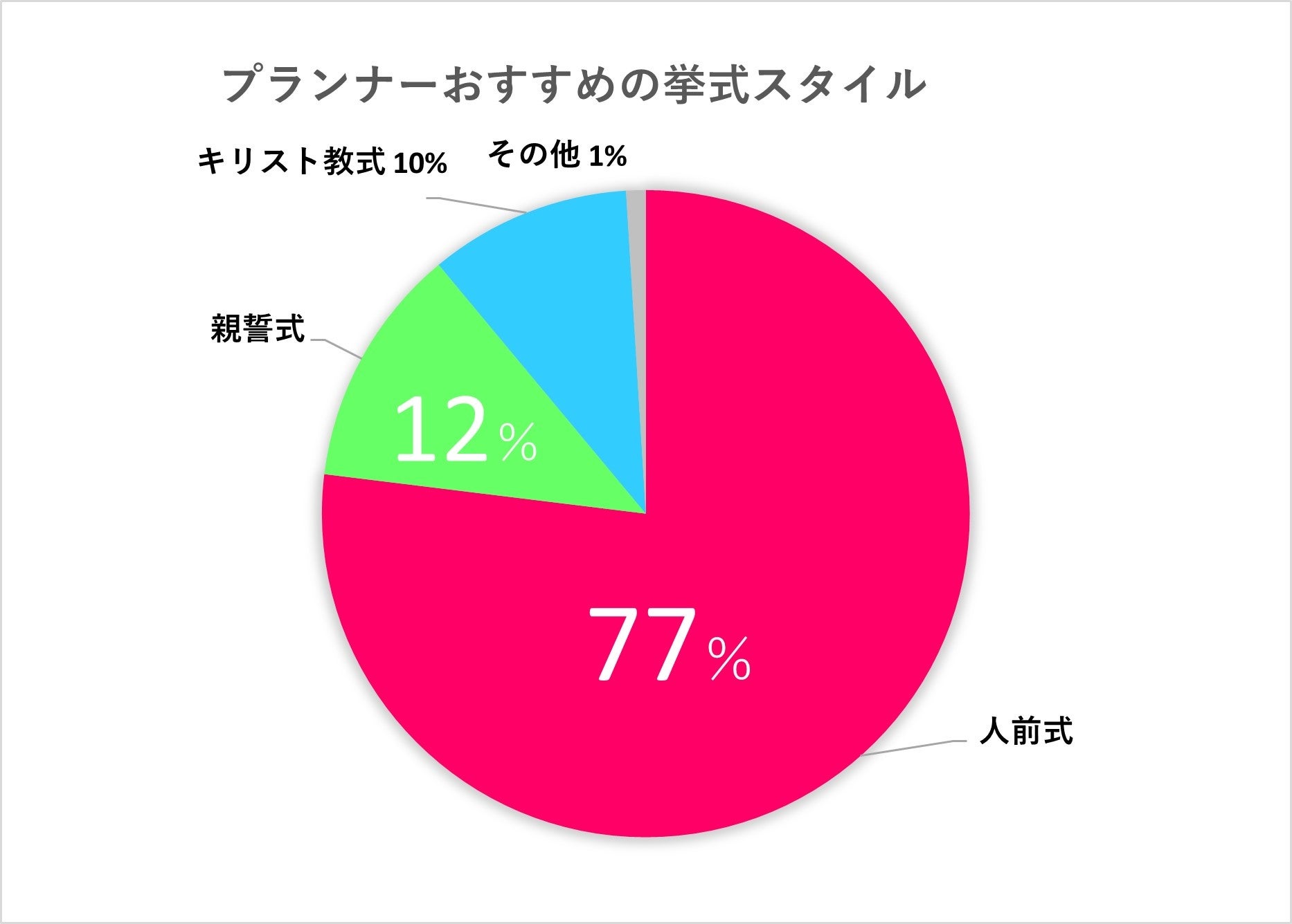 「キリスト教式」や「人前式」、「神前式」など様々なスタイルがある中で、ウェディングプランナーがおすすめする挙式スタイルについて調査したところ、形式にとらわれない「人前式」が77%、T&Gオリジナルの「親誓式」が12%と、おふたりのオリジナリティを反映できる挙式スタイルが約9割という結果に。