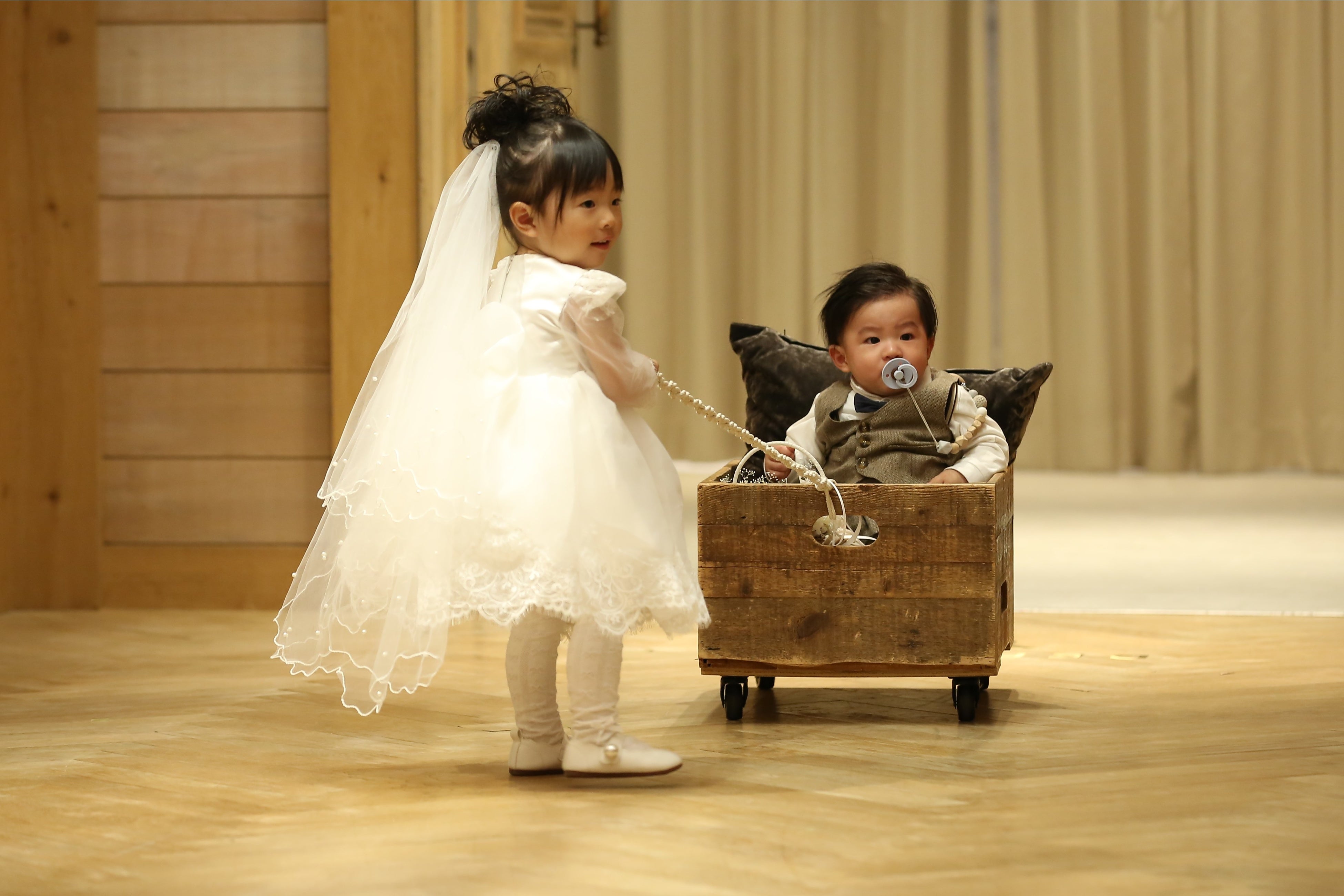 A.挙式のリングキッズカーは盛り上がります。まだ歩くことができないお子さまでも、車を引いてもらったり、ラジコンタイプの車に乗ることで大役を務められます!お子さまを挟んでの誓いのキスも思い出になります。(ベイサイド迎賓館 和歌山/石井利奈)