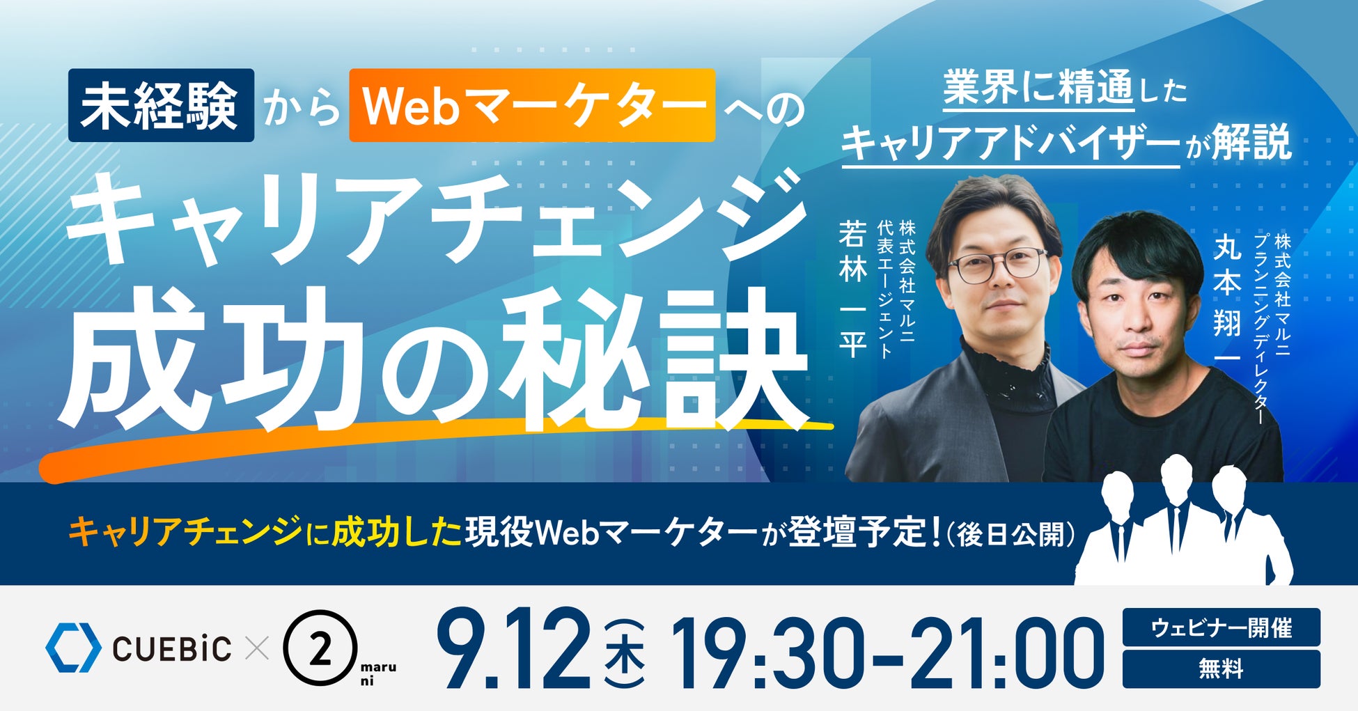 株式会社キュービック(本社:東京都新宿区、代表取締役:世一英仁、以下「キュービック」)は、この度『未経験からwebマーケターへのキャリアチェンジ 成功の秘訣』を9月12日(木)19時30分からウェビナー開催いたします。