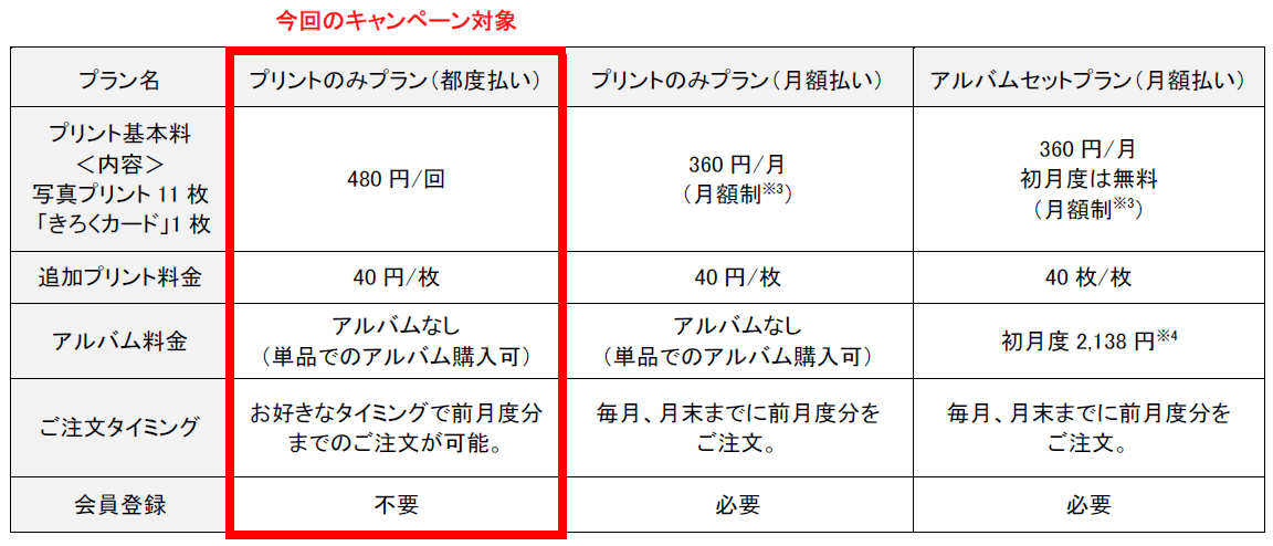 | プリントのみプラン(都度払い) | クーポン番号 | キャンペーン料金 | 通常価格 |