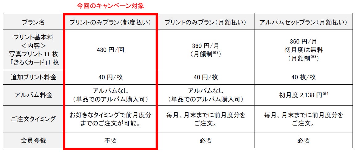 今回のキャンペーンでは、「かぞくのきろく」をより多くの方に気軽に体験いただくために、本アプリではじめてご注文いただくお客様に、会員登録なしでご注文いただける「プリントのみプラン(都度払い)」※1 (通常税込み480円/回・送料無料)を半額の240円(税込み・送料無料)でご提供いたします。また、すでに本アプリをご利用いただいているお客様は、同プランを25%オフの360円(税込み・送料無料)で期間中に何度でもご注文いただけます。