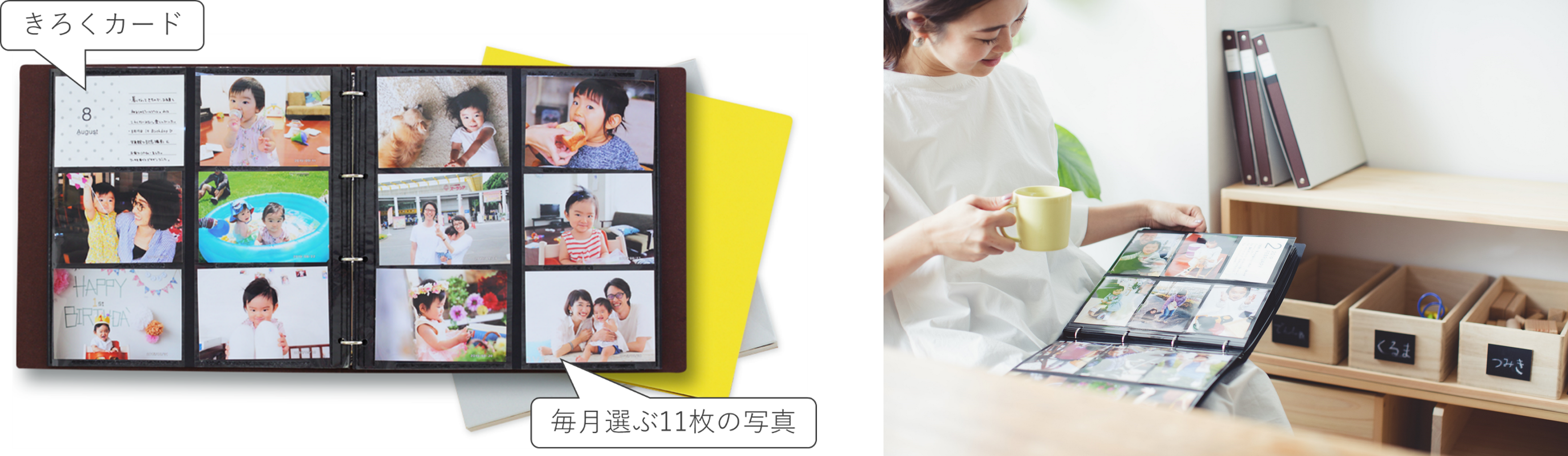 写真整理アプリ「かぞくのきろく」は、スマホに保存されている大量の画像データの中から、ユーザーが毎月11枚を選んで注文すると、指定の住所に写真プリントが届く便利なアプリです。合わせて、その月の思い出を綴る“きろくカード”も注文できます。1年間続けることで、132枚の写真が詰まった1冊の家族アルバムが完成します。忙しい中でも簡単にアルバムづくりを続けることができ、多くのお客様からご好評をいただいています。