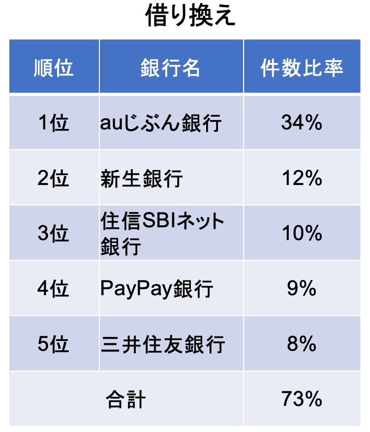 auじぶん銀行が非常に多い結果となりました。金利引き下げキャンペーンを実施したことが大きいと考えられます。家計改善のため、少しでも安い金利の住宅ローンを探している借り換えユーザーを数多くひきつけているものと考えられます。2位の新生銀行と4位のPayPay銀行など、金利引き下げキャンペーン実施行の人気ぶりが目立ちます。