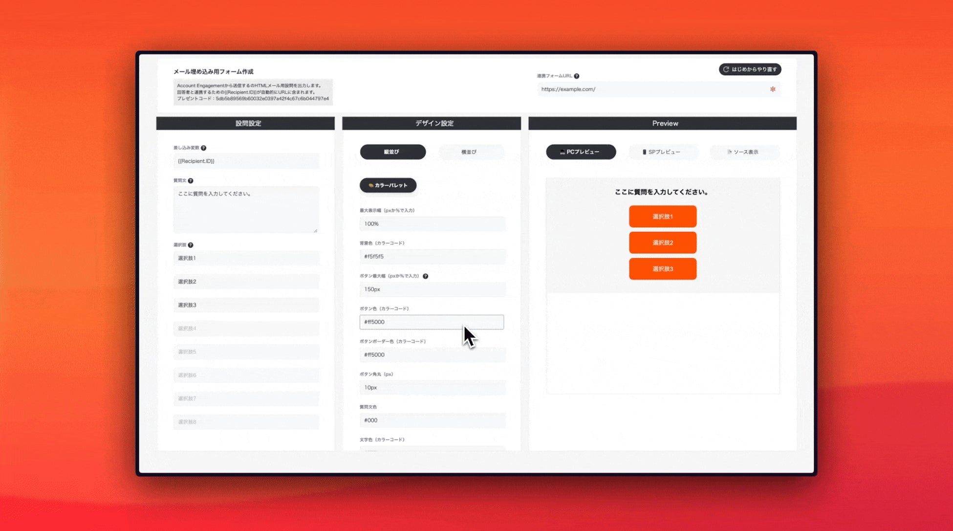 設問文や選択肢をテキストで入力し、選択肢ボタンのカラーやサイズを選ぶだけで、メール本文に埋め込むアンケートのHTMLが自動で作成されます。直感的な操作で作成できるため、配信先に合わせてカスタマイズしたアンケートを手間なく実施できるようになります。