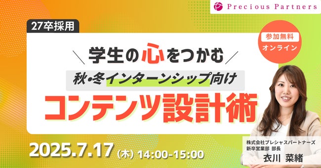 採用コンサルティング事業を行う株式会社プレシャスパートナーズ(本社:東京都新宿区、代表取締役社長 CEO:髙﨑 誠司)は、2025年7月17日(木)に『【27卒採用】学生の心をつかむ秋・冬インターンシップ向けコンテンツ設計術』をオンラインにて開催いたします。