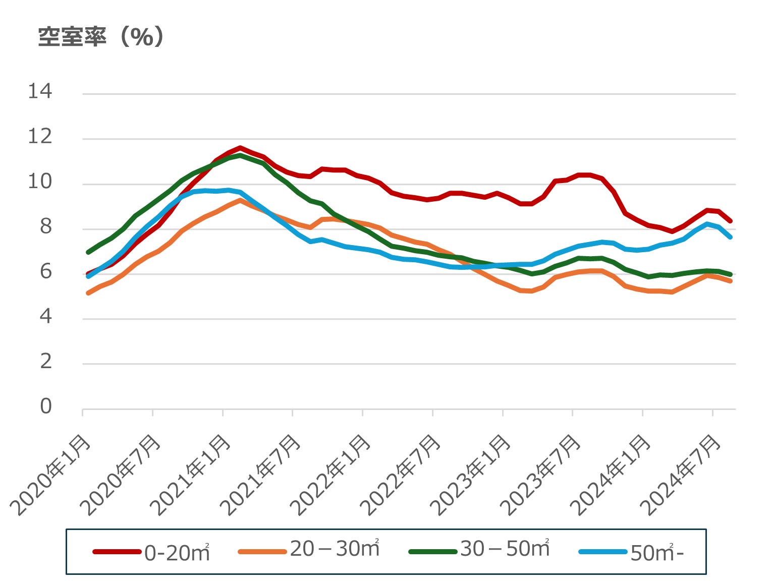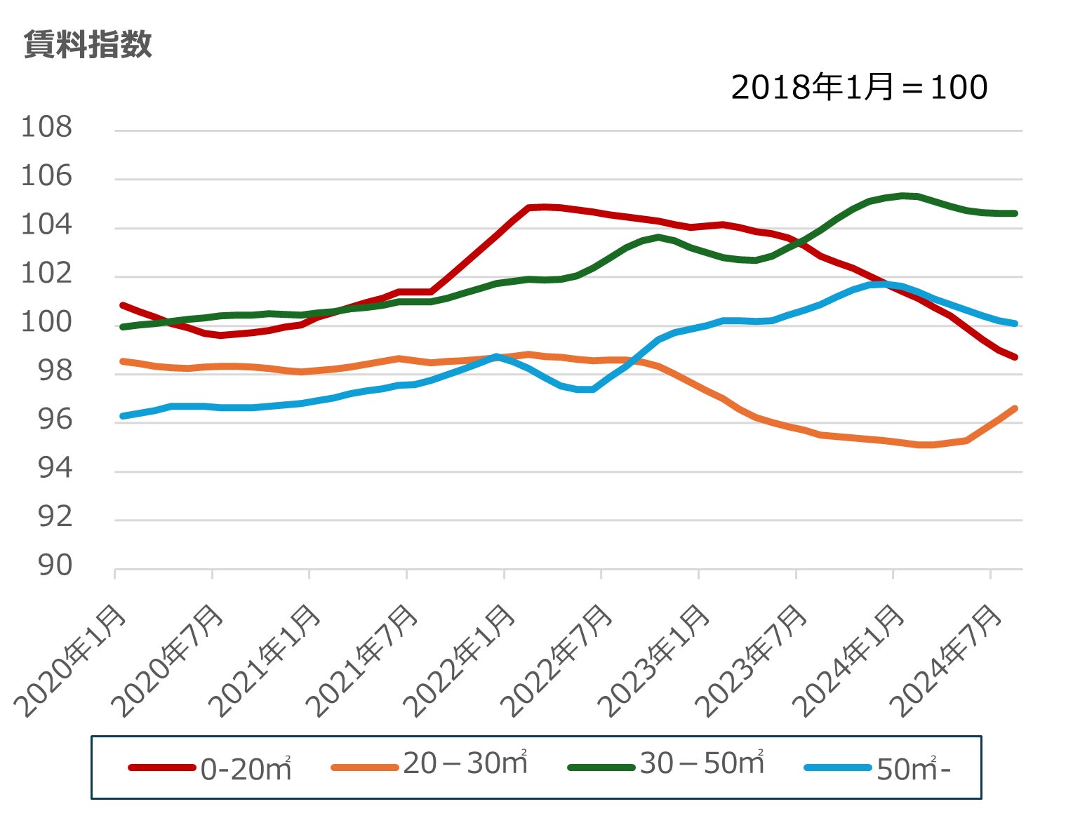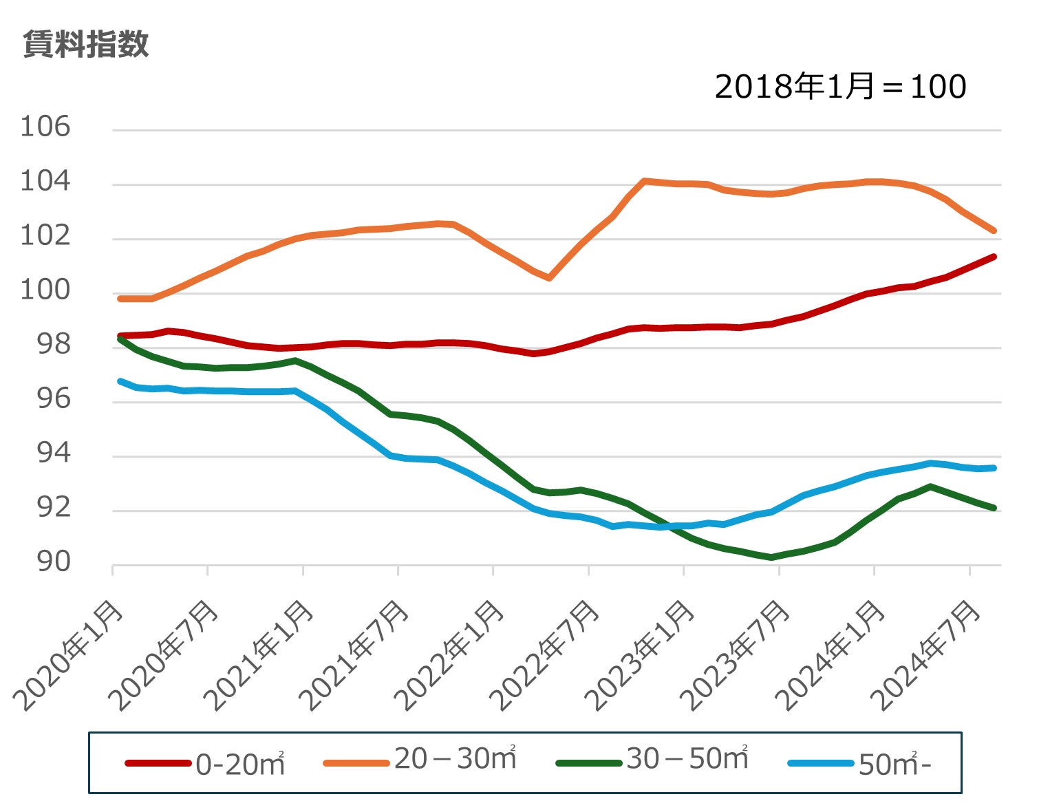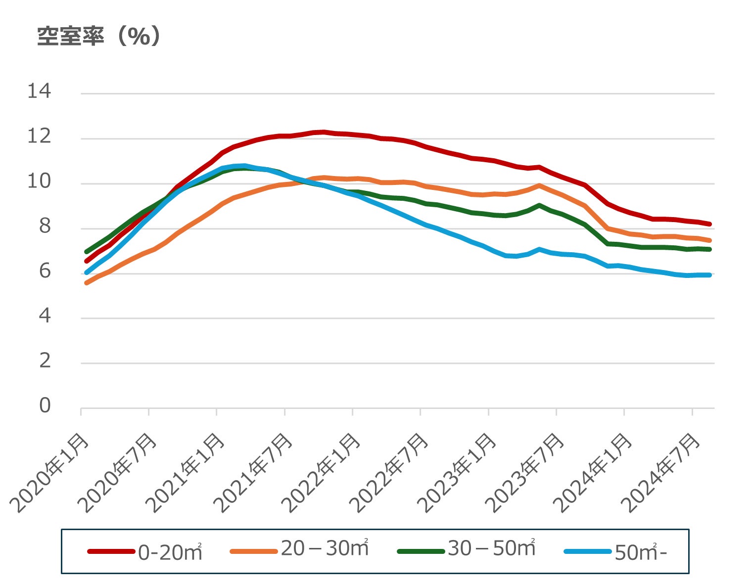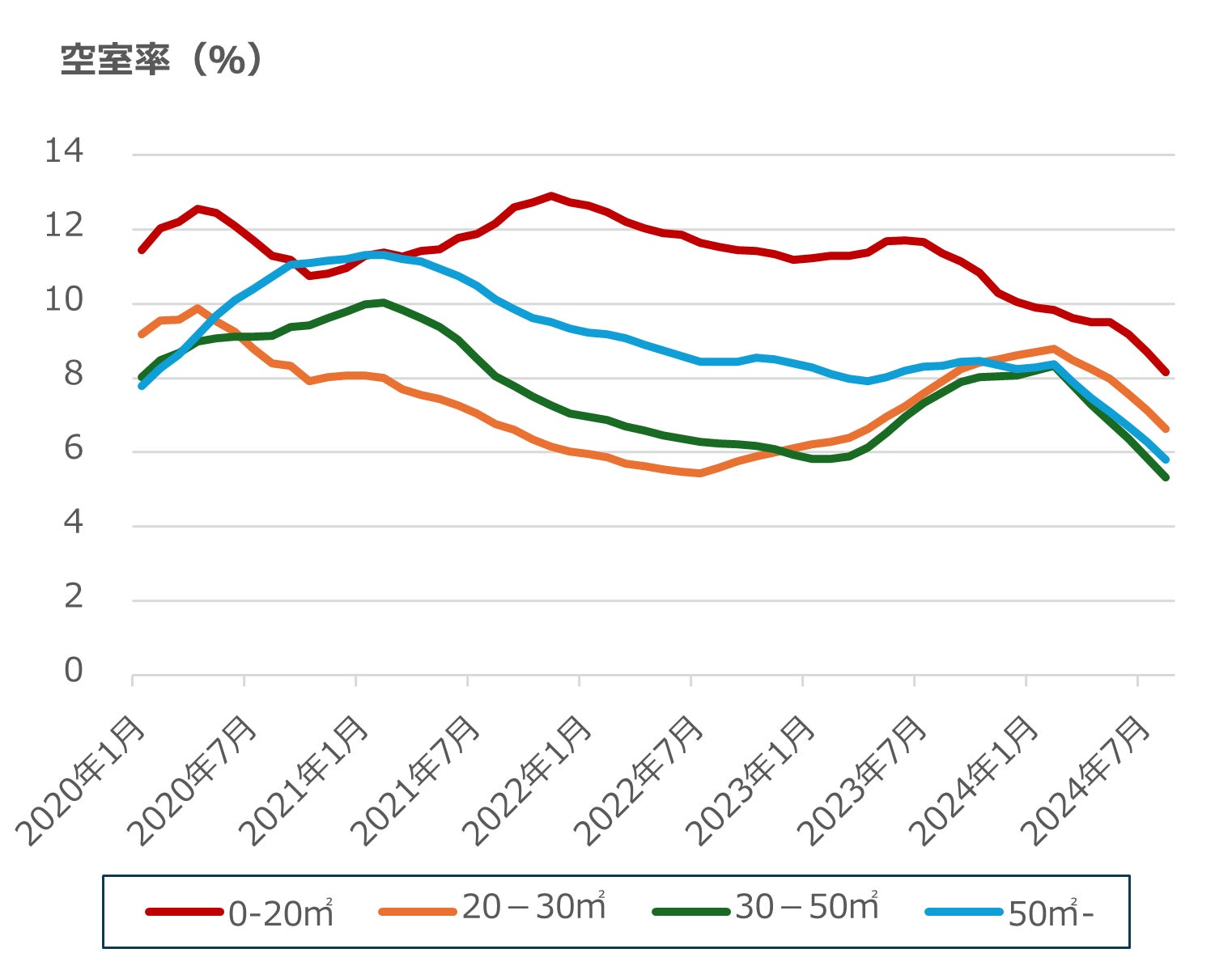 東京23区では、人口流入の回復により空室率が改善傾向にあります。特に、30-50㎡および50㎡以上の物件で支払い賃料の上昇が見られる一方、0-20㎡や20-30㎡の物件は供給過剰により、賃料が横ばいまたは下落傾向です。賃料の低い物件から順に成約が進んでいることが示唆されます。