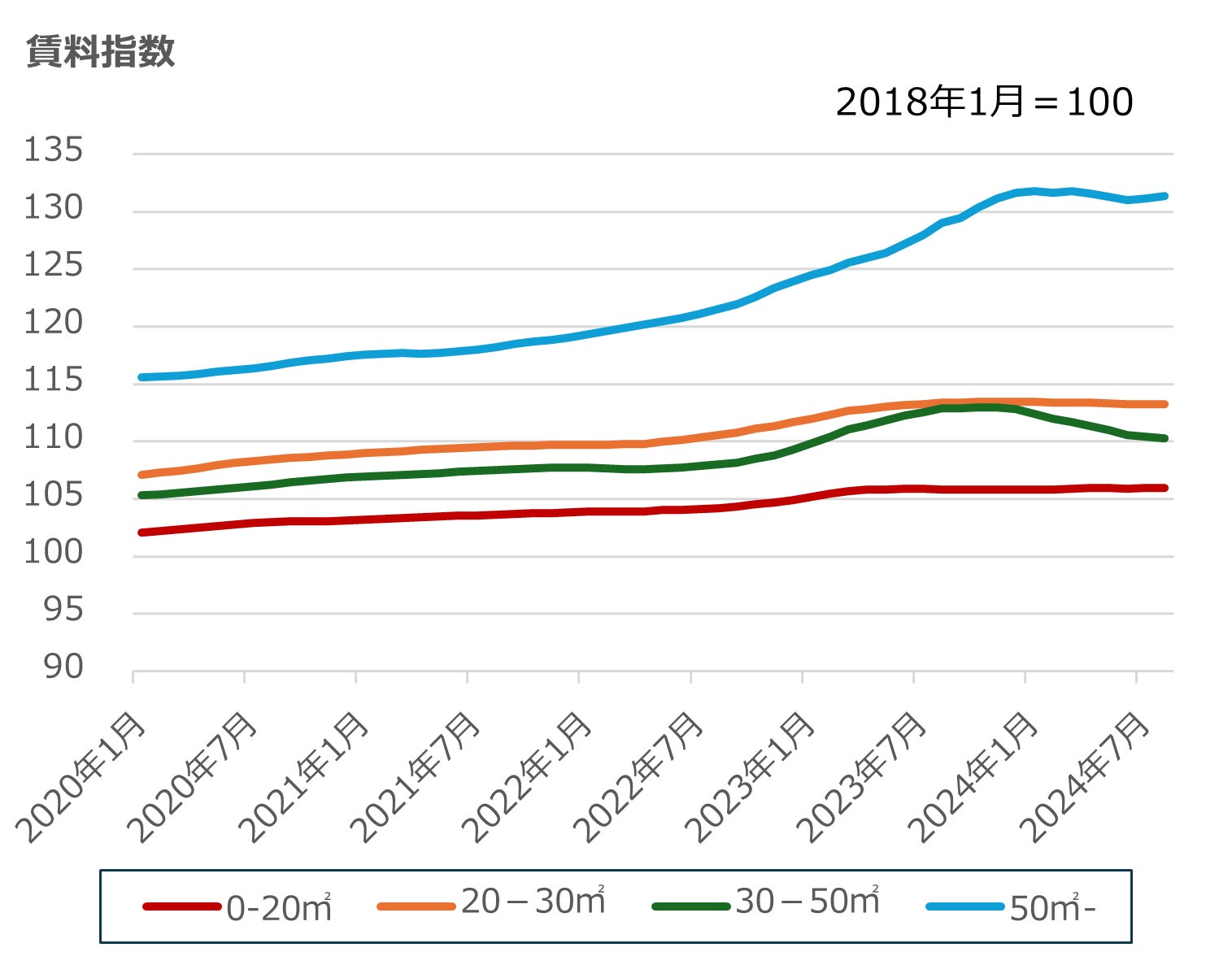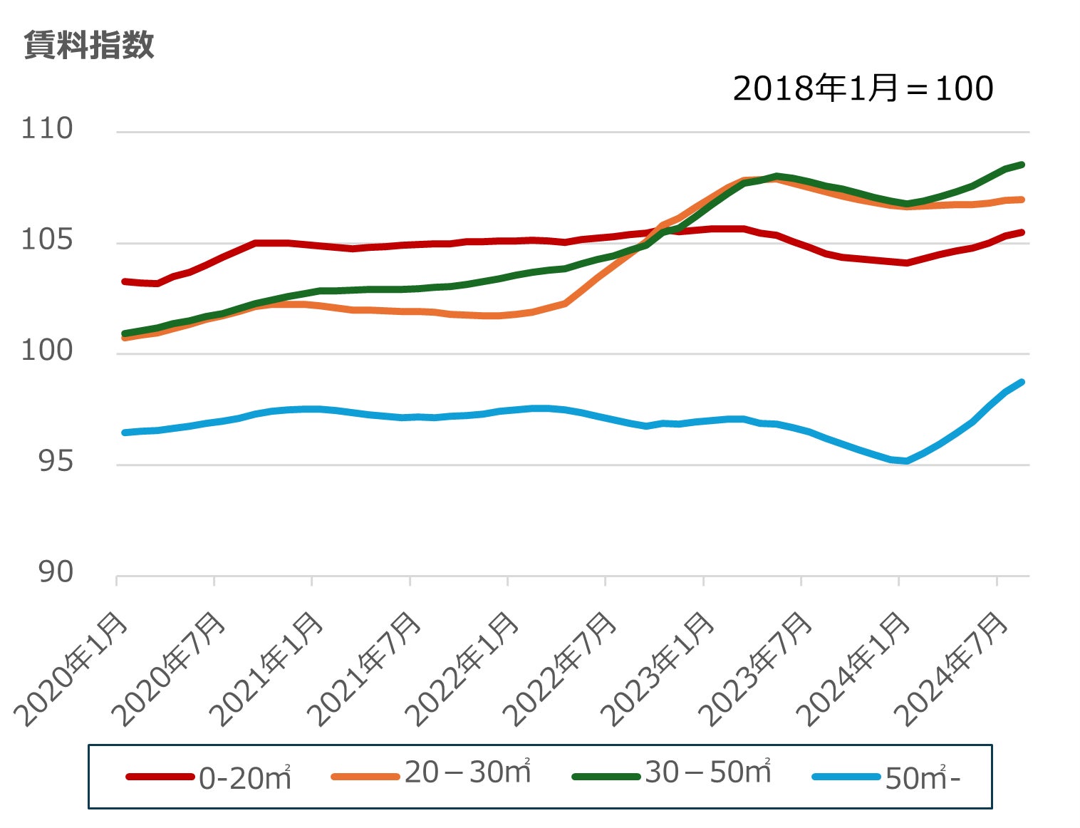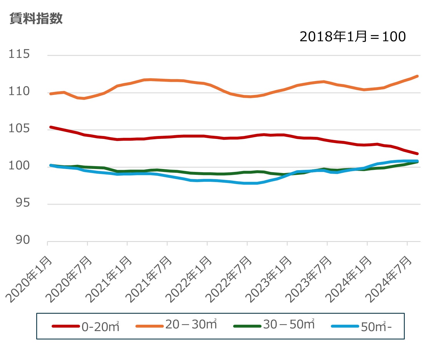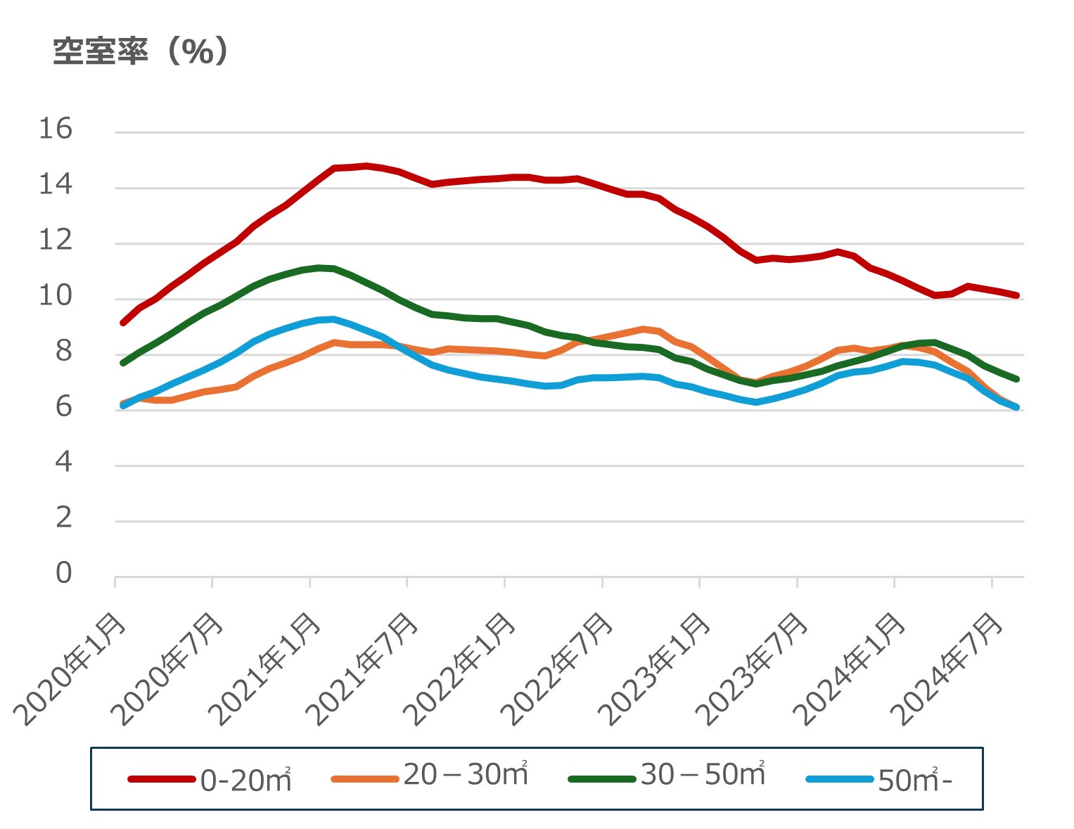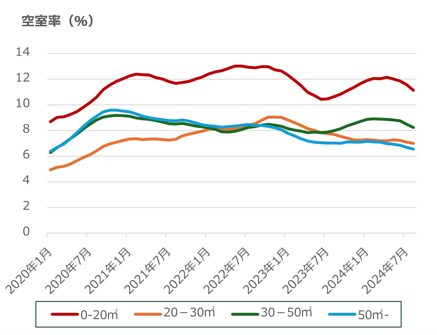 東京23区では、人口流入の回復により空室率が改善傾向にあります。特に、30-50㎡および50㎡以上の物件で支払い賃料の上昇が見られる一方、0-20㎡や20-30㎡の物件は供給過剰により、賃料が横ばいまたは下落傾向です。賃料の低い物件から順に成約が進んでいることが示唆されます。
