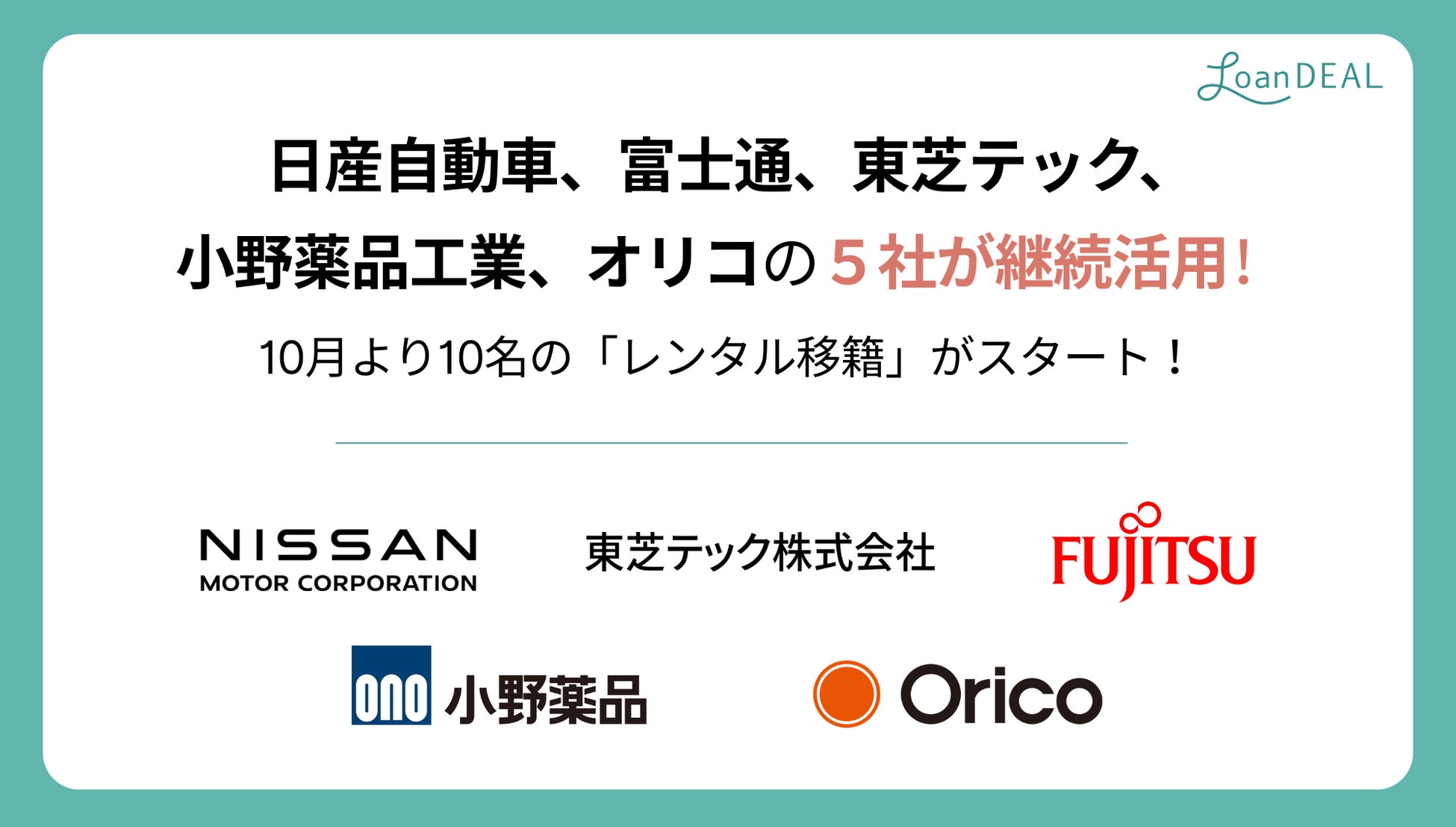 日産自動車、東芝テック、富士通、小野薬品工業、オリコの5社が継続活用!10名の「レンタル移籍」が10月より新たにスタート。