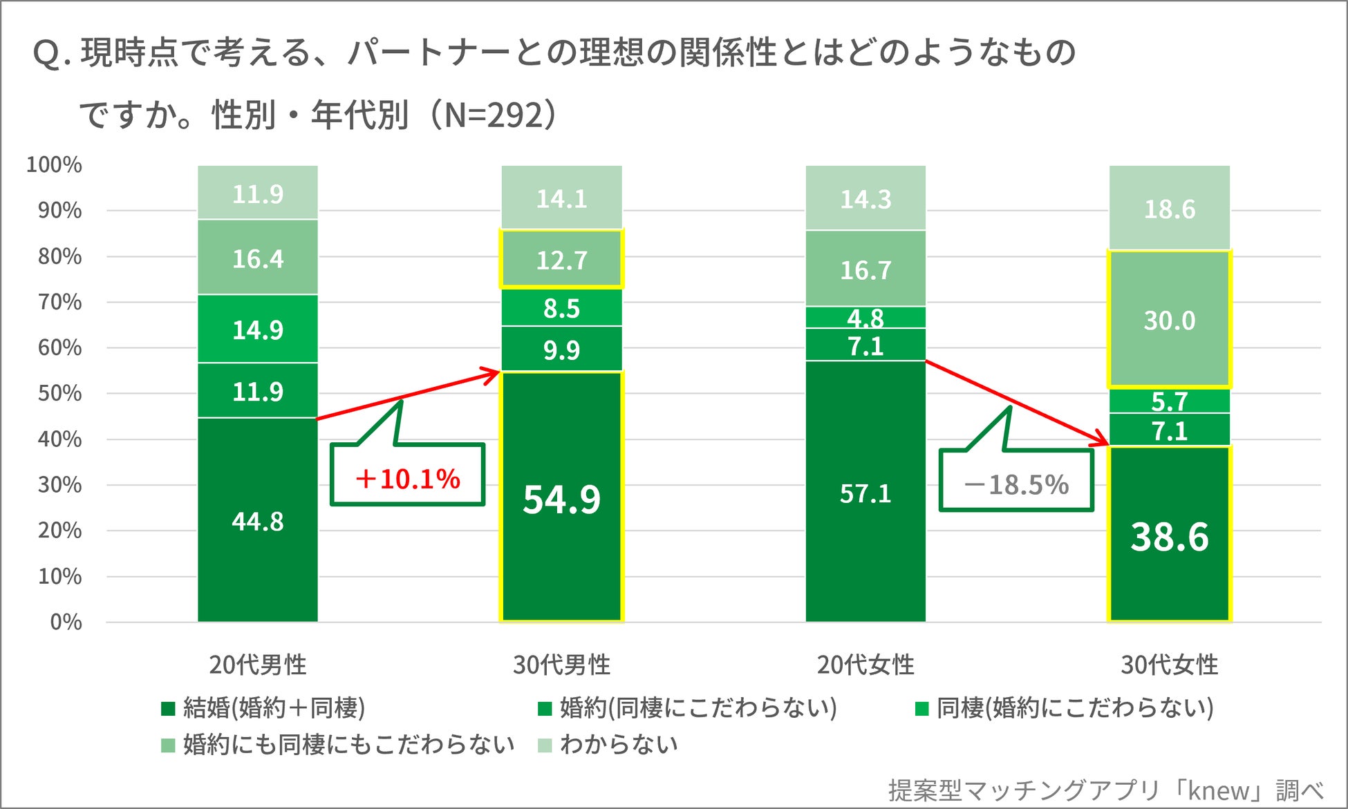 それが「婚約にも同棲にもこだわらない」割合が最も高いのが30代女性(30.0%)、最も低いのが30代男性(12.7%)という結果にも繋がっているかもしれません。
