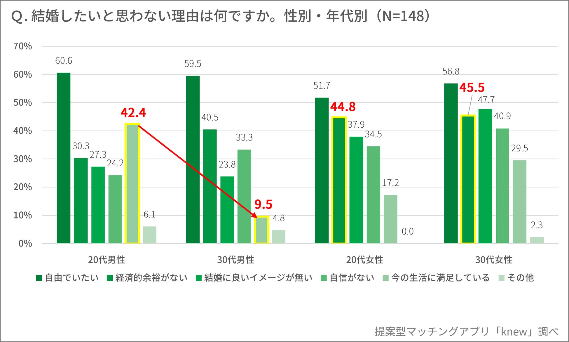 - 「今の生活に満足している」を理由にあげた割合が、20代男性が42.4%であるのに対し、30代男性では9.5%に激減