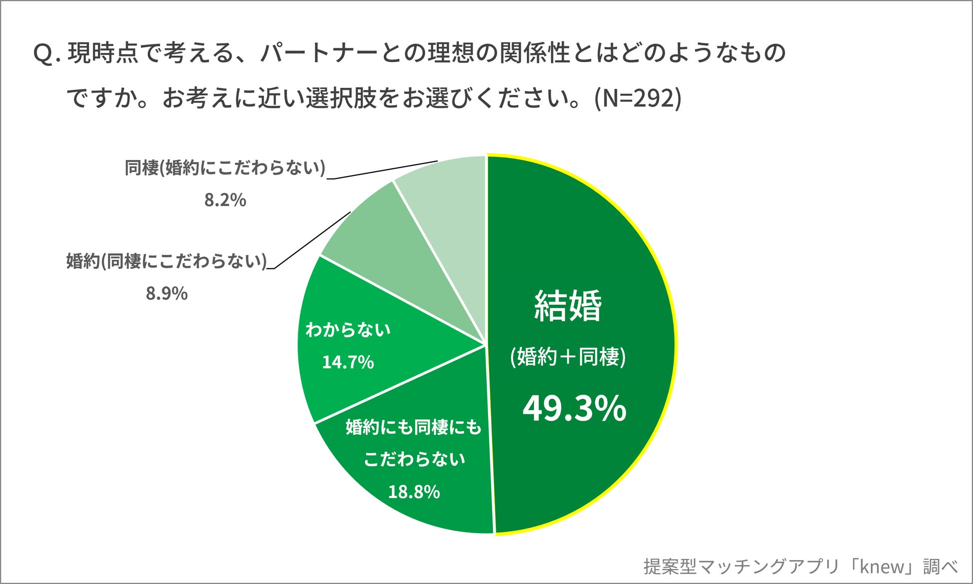 - パートナーとの理想の関係性、第1位は「結婚(婚約+同棲)49.3%」、第2位は「婚約にも同棲にもこだわらない 18.8%」、第3位は「わからない 14.7%」