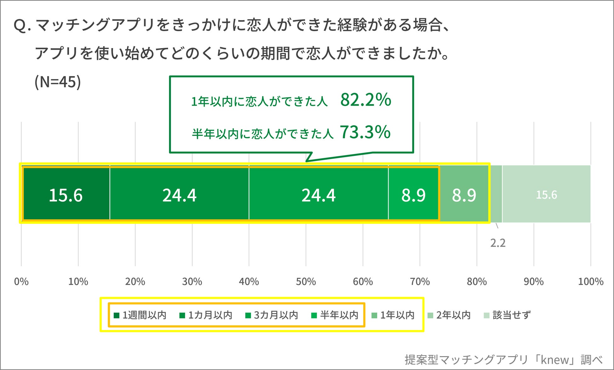 - 婚活中のマッチングアプリ利用者のうち、アプリ利用開始から「1年以内」に恋人ができた経験がある人は82.2%、「半年以内」に恋人ができた経験がある人は73.3%