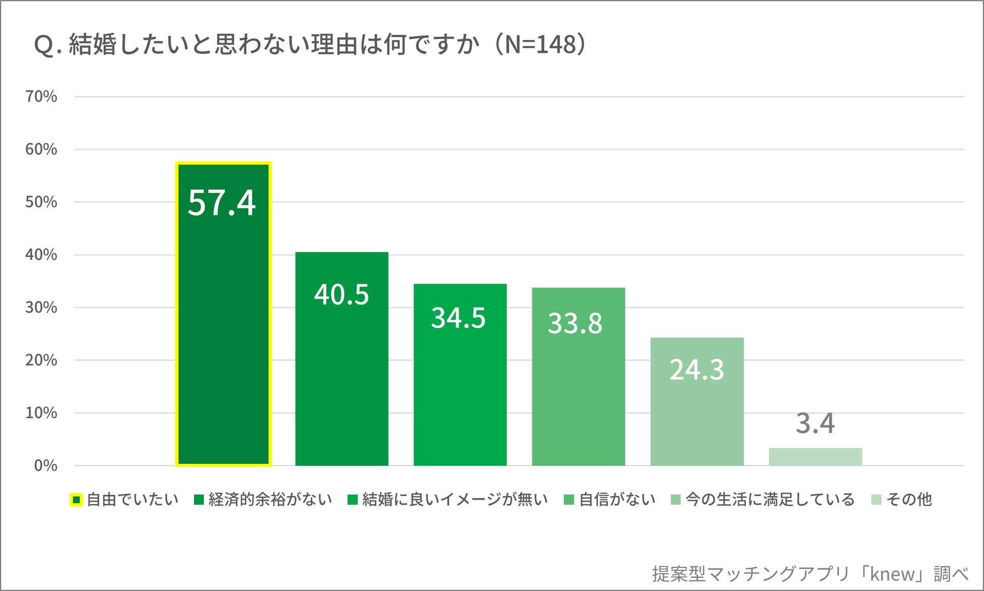 - 一生結婚するつもりがない人の「結婚したいと思わない」理由、第1位「自由でいたい 57.4%」、第2位「経済的余裕がない 40.5%」、第3位「結婚に良いイメージがない 34.5%」