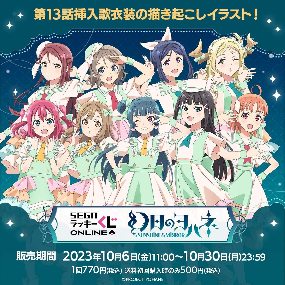セガ ラッキーくじオンライン「幻日のヨハネ -SUNSHINE in the MIRROR-」では、TVアニメ第13話挿入歌でお披露目された衣装を元に、このくじのために新規の描き起こしイラストをご用意いたしました。