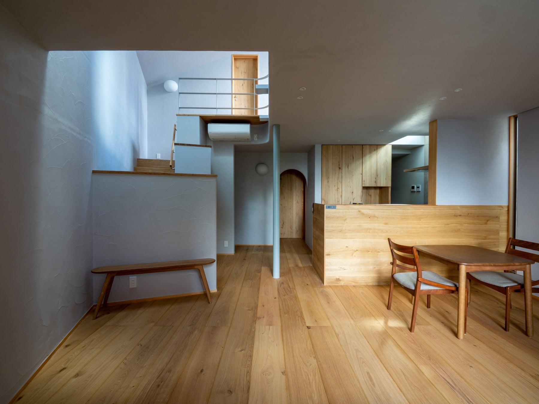 階段やキッチンの一部に吹き抜けを通し、縦空間を意識的に取り入れることで、落ち着いた印象の室内にメリハリが生まれています。