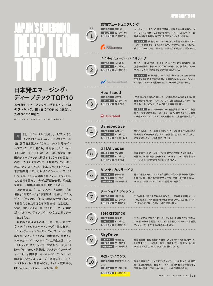 最初の外部資本導入から7年以内の未上場ディープテックのランキングTOP10に選ばれた10社を紹介と、新進気鋭の注目企業40社を紹介しています。