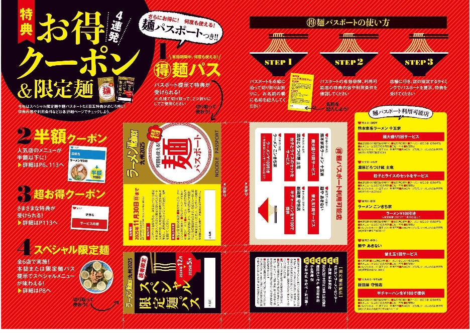 巻頭の目玉コンテンツでは、人気のスペシャル特典がさらにお得に。有効期間中なら何度でも特典が受けられる「麺パスポート」をはじめ、無料や半額で絶品ラーメンを試食できるクーポンなど “お得”が盛りだくさん。毎年好評の限定麺企画では、切り取って持ち運べる「限定麺パス」も付いて、本誌を持参せずとも「限定麺パス」の提示で限定メニューが楽しめるようになりました。