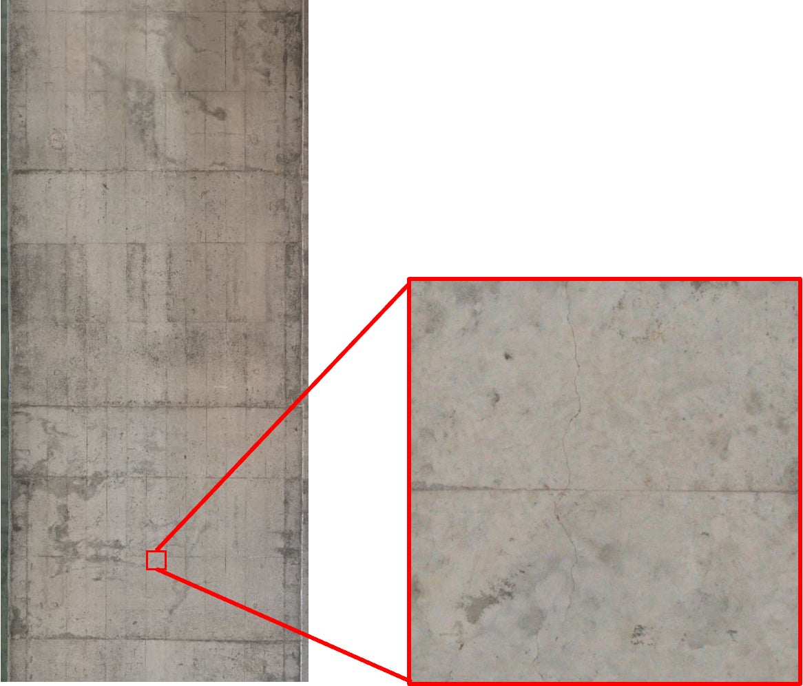 また画像撮影後のオルソモザイク画像作成は壁状構造物の場合と同様のプロセスで行われ、「性能カタログ」に記載される撮影仕様を適用した場合、最小ひびわれ幅0.05mm、幅計測精度(RMS)0.1mm未満のオルソモザイク画像が作成されます。